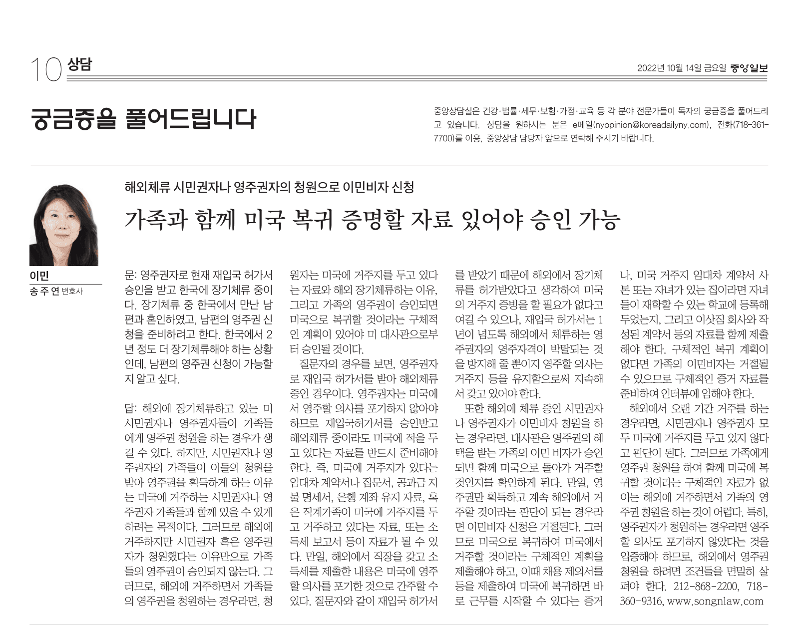 그러므로, 해외에 거주하면서 가족들의 영주권을 청원하는 경우라면, 청원자는 미국에 거주지를 두고 있다는 자료와 해외 장기 체류하는 이유, 그리고 가족의 영주권이 승인되면 미국으로 복귀할 것이라는 구체적인 계획이 있어야 미 대사관으로부터 승인될 것이다.