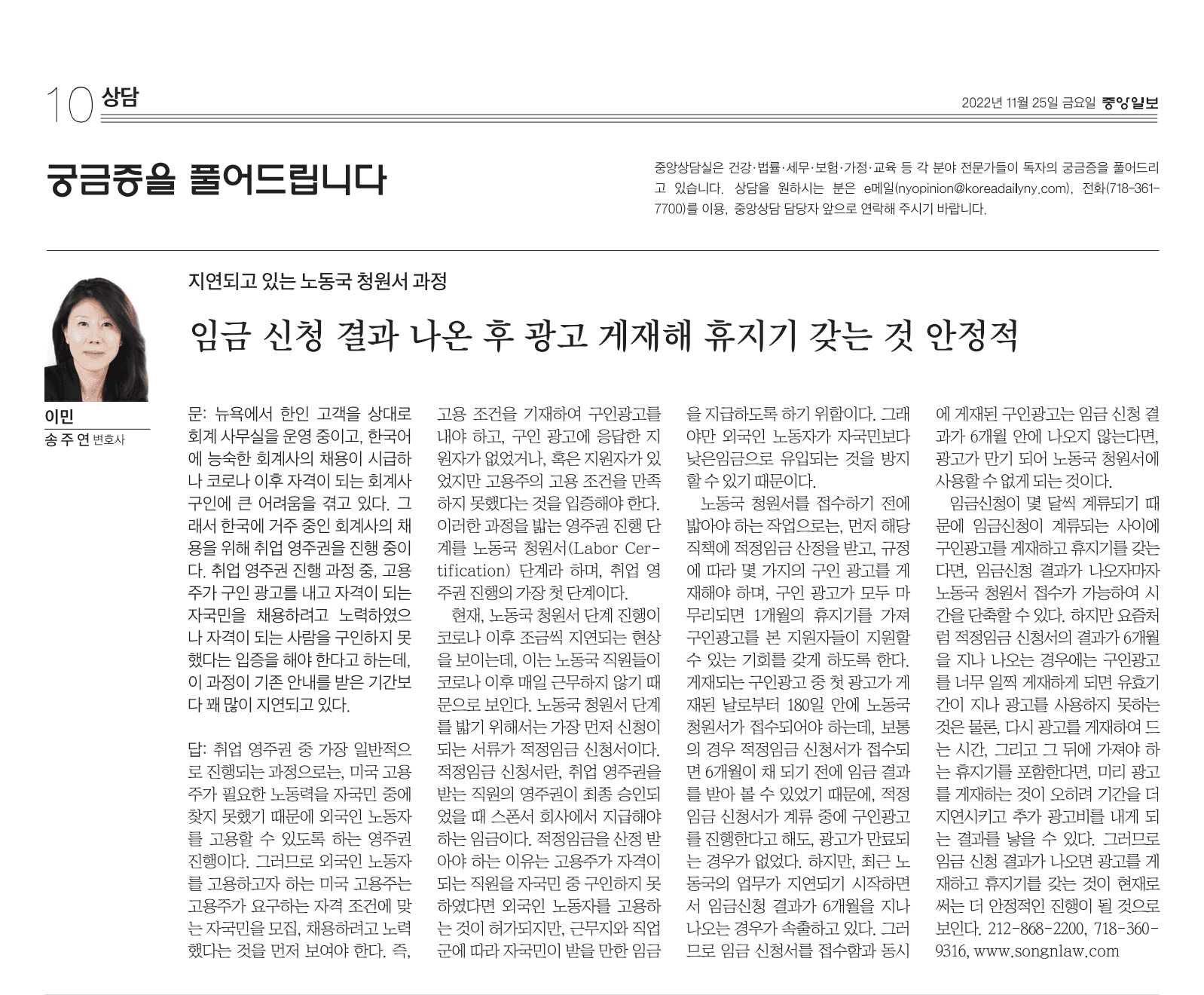 임금 신청이 몇 달씩 계류되기 때문에 임금 신청이 계류되는 사이에 구인 광고를 게재하고 휴지기를 갖는다면, 임금 신청 결과가 나오자마자 노동국 청원서 접수가 가능하여 시간을 단축할 수 있다. 하지만 요즘처럼 적정 임금 신청서의 결과가 6개월을 지나 나오는 경우에는 구인 광고를 너무 일찍 게재하게 되면 유효기간이 지나 광고를 사용하지 못하는 것은 물론, 다시 광고를 게재해야 하는 시간, 그리고 그 뒤에 가져야 하는 휴지기를 포함한다면, 미리 광고를 게재하는 것이 오히려 기간을 더 지연시키고 추가 광고비를 내게 되는 결과를 낳을 수 있다. 그러므로 임금 신청 결과가 나오면 광고를 게재하고 휴지기를 갖는 것이 현재로써는 더 안정적인 진행이 될 것으로 보인다.