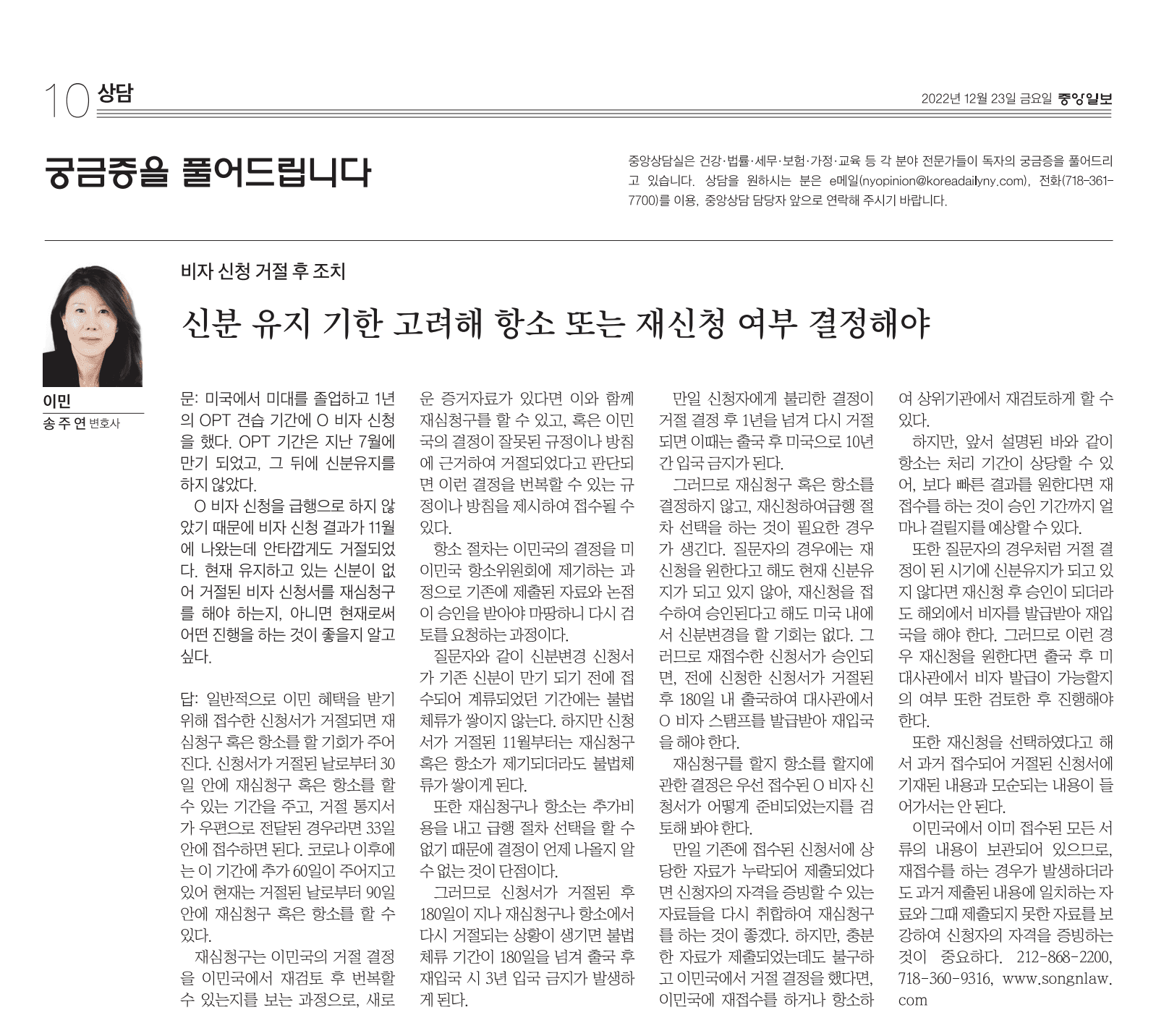그러므로 재심 청구 혹은 항소를 결정하지 않고, 재신청하여 급행 절차 선택을 하는 것이 필요한 경우가 생긴다. 질문자의 경우에는 재신청을 원한다고 해도 현재 신분 유지가 되고 있지 않아, 재신청을 접수하여 승인된다고 해도 미국 내에서 신분 변경을 할 기회는 없다.