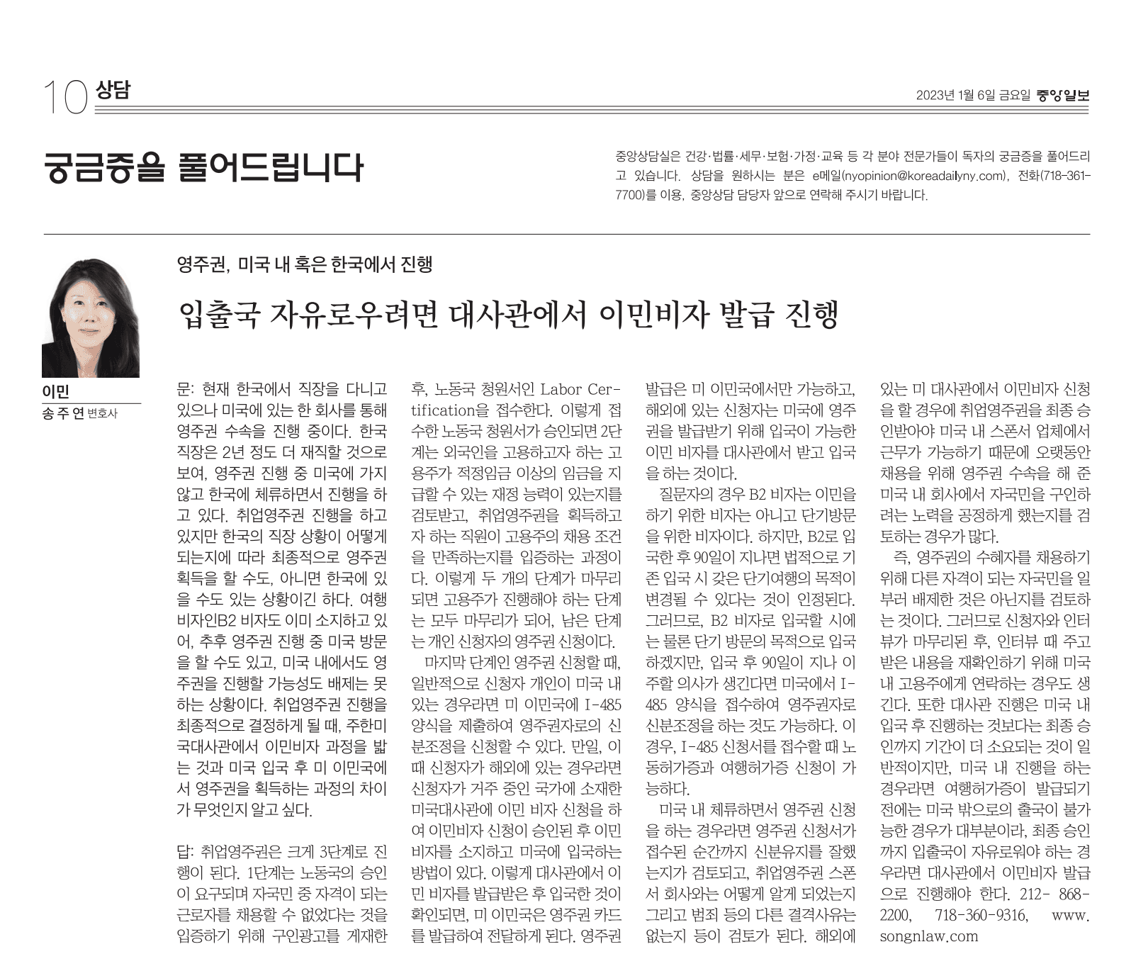 현재 한국에서 직장을 다니고 있으나 미국에 있는 한 회사를 통해 영주권 수속을 진행 중이다. 한국 직장은 2년 정도 더 재직할 것으로 보여, 영주권 진행 중 미국에 가지 않고 한국에 체류하면서 진행하고 있다. 취업 영주권 진행을 하고 있지만 한국의 직장 상황이 어떻게 되는지에 따라 최종적으로 영주권 획득을 할 수도, 아니면 한국에 있을 수도 있는 상황이긴 하다. 여행 비자인 B2 비자도 이미 소지하고 있어, 추후 영주권 진행 중 미국 방문을 할 수도 있고, 미국 내에서도 영주권을 진행할 가능성도 배제는 못 하는 상황이다. 취업 영주권 진행을 최종적으로 결정하게 될 때, 주한 미국 대사관에서 이민 비자 과정을 밟는 것과 미국 입국 후 미 이민국에서 영주권을 획득하는 과정의 차이가 무엇인지 알고 싶다.