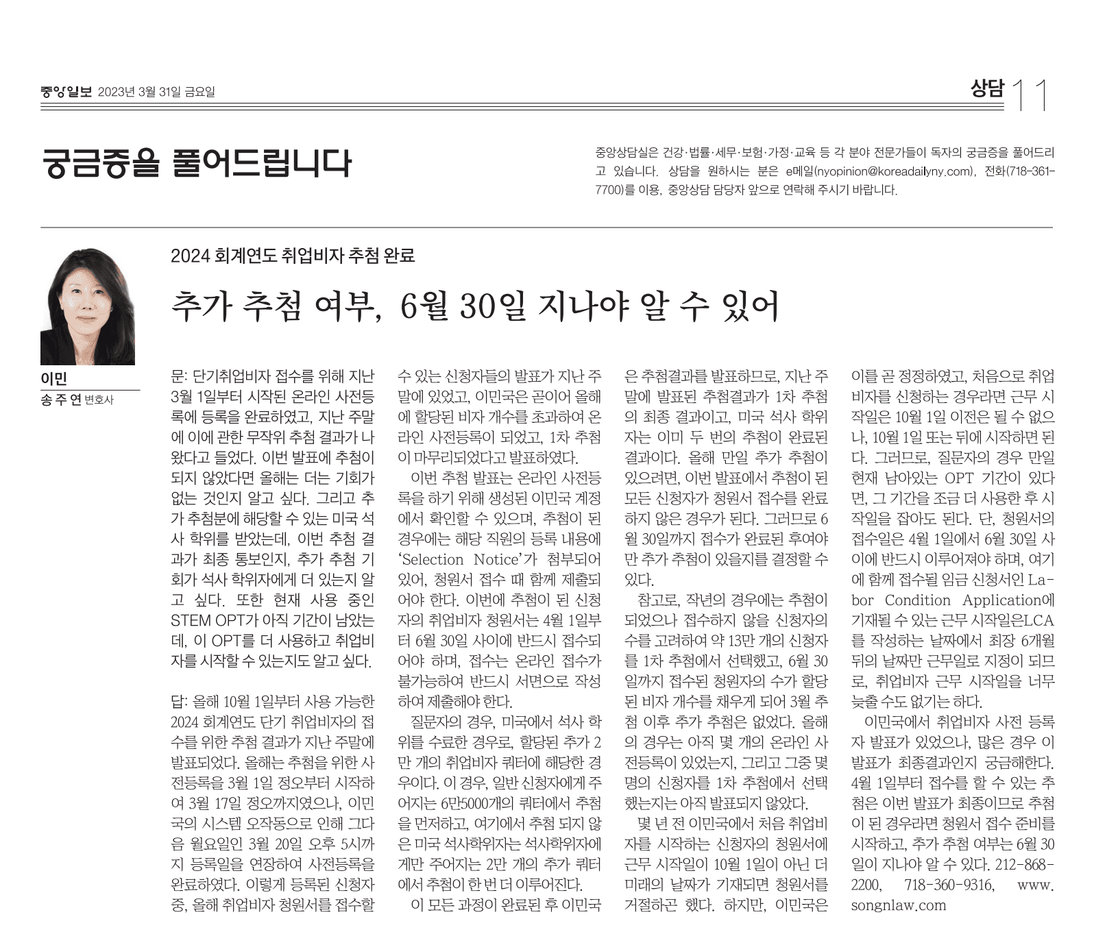 이민국에서 취업 비자 사전 등록자 발표가 있었으나, 많은 경우 이 발표가 최종 결과인지 궁금해한다. 4월 1일부터 접수를 할 수 있는 추첨은 이번 발표가 최종이므로 추첨이 된 경우라면 청원서 접수 준비를 시작하고, 추가 추첨 여부는 6월 30일이 지나야 알 수 있다.