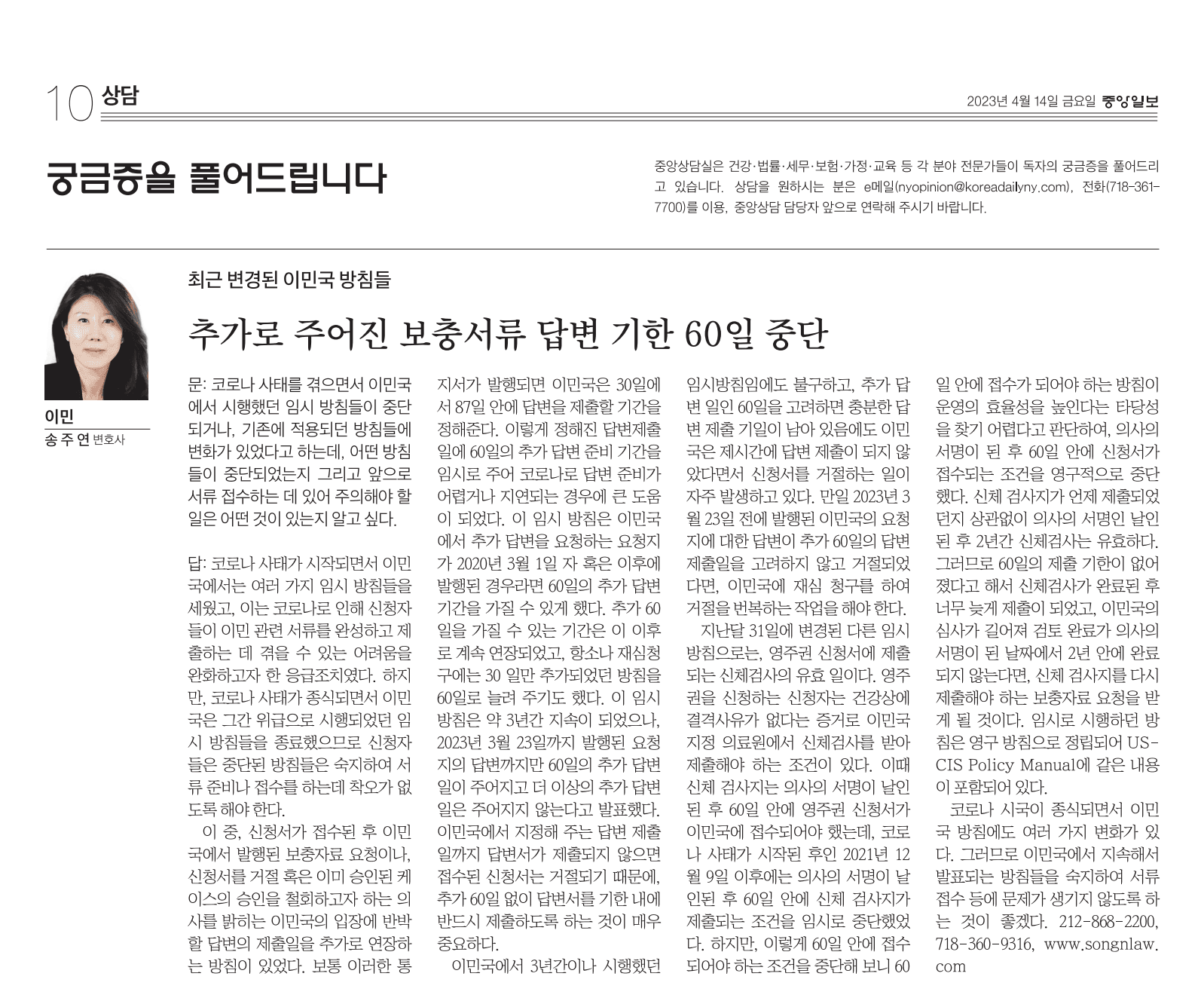 코로나 사태가 시작되면서 이민국에서는 여러 가지 임시 방침들을 세웠고, 이는 코로나로 인해 신청자들이 이민 관련 서류를 완성하고 제출하는 데 겪을 수 있는 어려움을 완화하고자 한 응급 조치였다. 하지만, 코로나 사태가 종식되면서 이민국은 그간 위급으로 시행되었던 임시 방침들을 종료했으므로 신청자들은 중단된 방침들을 숙지하여 서류 준비나 접수를 하는 데 착오가 없도록 해야 한다.