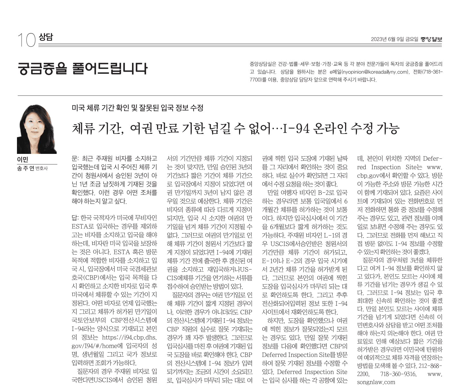 질문자의 경우처럼 3년을 체류한다고 여겨 I-94 정보를 확인하지 않고 있다가, 본인도 모르는 사이에 체류 기간을 넘기는 경우가 생길 수 있다. 그러므로 I-94 정보는 입국 후 최대한 신속히 확인하는 것이 좋겠다. 만일 본인도 모르는 사이에 체류 기간을 넘기게 되었다면 신속히 이민 변호사와 상담을 받고 어떤 조처를 해야 하는지 의논해야 한다. 여권 만료일로 인해 예상보다 짧은 기간을 허가받은 경우라면 이민국에 탄원하여 예외적으로 체류 자격을 연장하는 방법을 모색해 볼 수 있다.