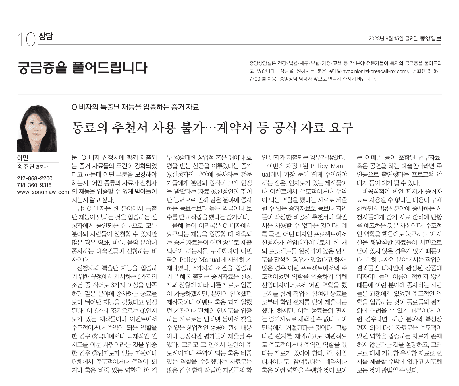 올해 들어 이민국은 비자에서 요구되는 재능을 입증할 때 제출되는 증거 자료들이 어떤 종류로 제출되어야 하는지를 구체화하여 이민 Policy Manual을 개정하였다. 6가지의 조건을 입증하기 위해 제출되는 증거 자료는 신청자의 상황에 따라 다른 자료로 입증이 가능하겠지만 본인이 참여했던 제작물이나 이벤트 혹은 과거 일했던 기관이나 단체의 인지도를 입증하는 자료로는 인터넷 등에서 찾을 수 있는 상업적인 성공에 관한 내용이나 긍정적인 평가들이 제출될 수 있다. 그리고 그 안에서 본인이 주도적이거나 주역이 되는 혹은 비중 있는 역할을 수행했다는 자료로는 많은 경우 함께 작업한 지인들의 확인 편지가 제출되는 경우가 많았다.
