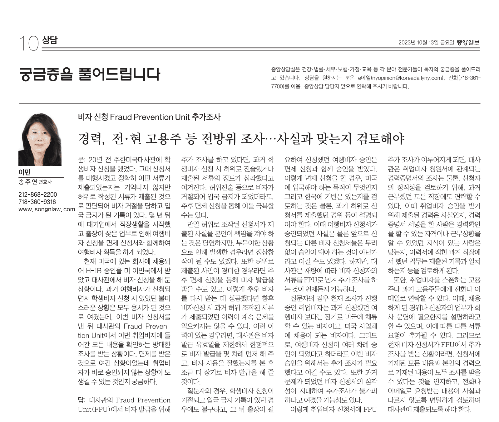 현재 미국에 있는 회사에 채용되어 H-1B 승인을 미 이민국에서 받았고 대사관에서 비자 신청을 해 둔 상황이다. 과거 여행비자가 신청되면서 학생비자 신청 시 있었던 불미스러운 상황은 모두 용서가 된 것으로 여겼는데, 이번 비자 신청서를 낸 뒤 대사관의 Fraud Prevention Unit에서 이번 취업비자에 들어간 모든 내용을 확인하는 방대한 조사를 받는 상황이다. 면제를 받은 것으로 여긴 상황이었는데 취업비자가 바로 승인되지 않는 상황이 또 생길 수 있는 것인지 궁금하다.