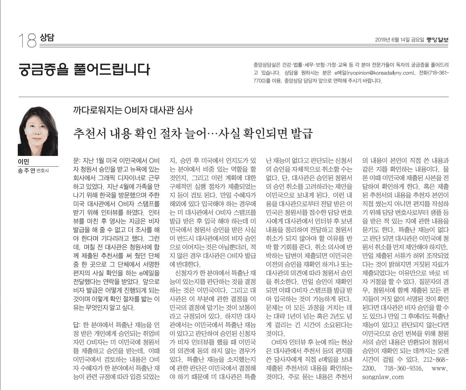 O비자 인터뷰 후 눈에 띄는 현상은 대사관에서 추천서 등의 편지를 쓴 당사자에게 직접 이메일을 보내 제출된 추천서의 내용을 확인하는 것이다. 주로 묻는 내용은 추천서의 내용이 본인이 직접 쓴 내용과 같은지를 확인하는 내용이다. 물론 이때 이민국에 제출된 사본을 전달하여 확인하게 한다.