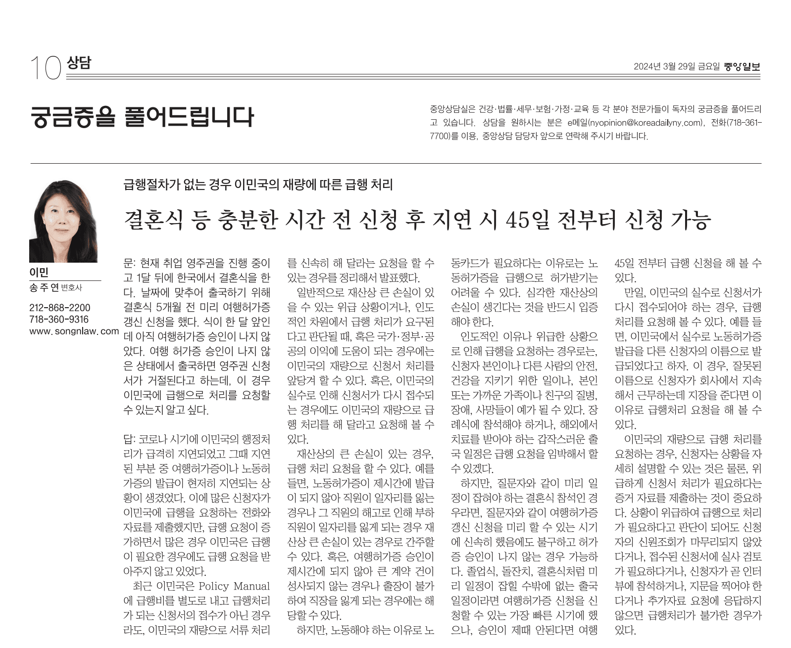 최근 이민국은 Policy Manual에 급행비를 별도로 내고 급행 처리가 되는 신청서의 접수가 아닌 경우라도, 이민국의 재량으로 서류 처리를 신속히 해 달라는 요청을 할 수 있는 경우를 정리해서 발표했다.