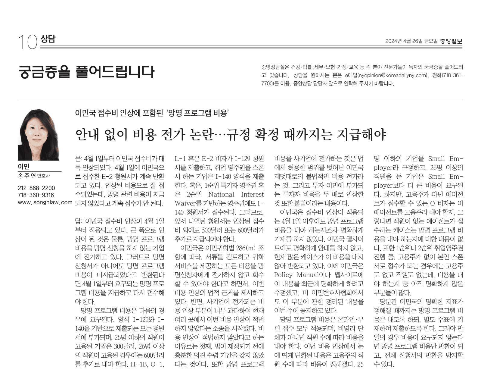 4월 1일부터 이민국 접수비가 대폭 인상되었다. 4월 1일에 이민국으로 접수한 E-2 청원서가 계속 반환되고 있다. 인상된 비용으로 잘 접수되었는데, 망명 관련 비용이 지급되지 않았다고 계속 접수가 안 된다.