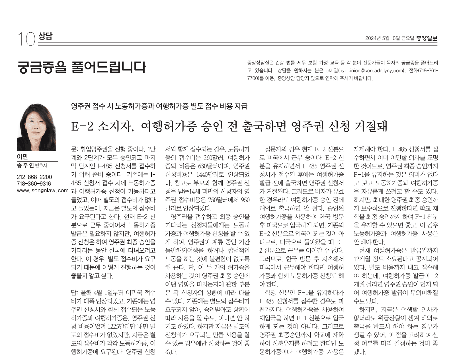 질문자의 경우 현재 E-2 신분으로 미국에서 근무 중이다. E-2 신분을 유지하면서 I-485 영주권 신청서가 접수된 후에는 여행허가증 발급 전에 출국하면 영주권 신청서가 거절된다. 그러므로 비자가 유효한 경우라도 여행허가증 승인 전에 해외로 출국하면 안 된다. 승인된 여행허가증을 사용하여 한국 방문 후 미국으로 입국하게 되면, 기존의 E-2 신분으로 입국이 되는 것이 아니므로, 미국으로 돌아왔을 때 E-2 신분으로 근무를 이어갈 수 없다. 그러므로, 한국 방문 후 지속해서 미국에서 근무해야 한다면 여행허가증과 함께 노동허가증 신청도 해야 한다.