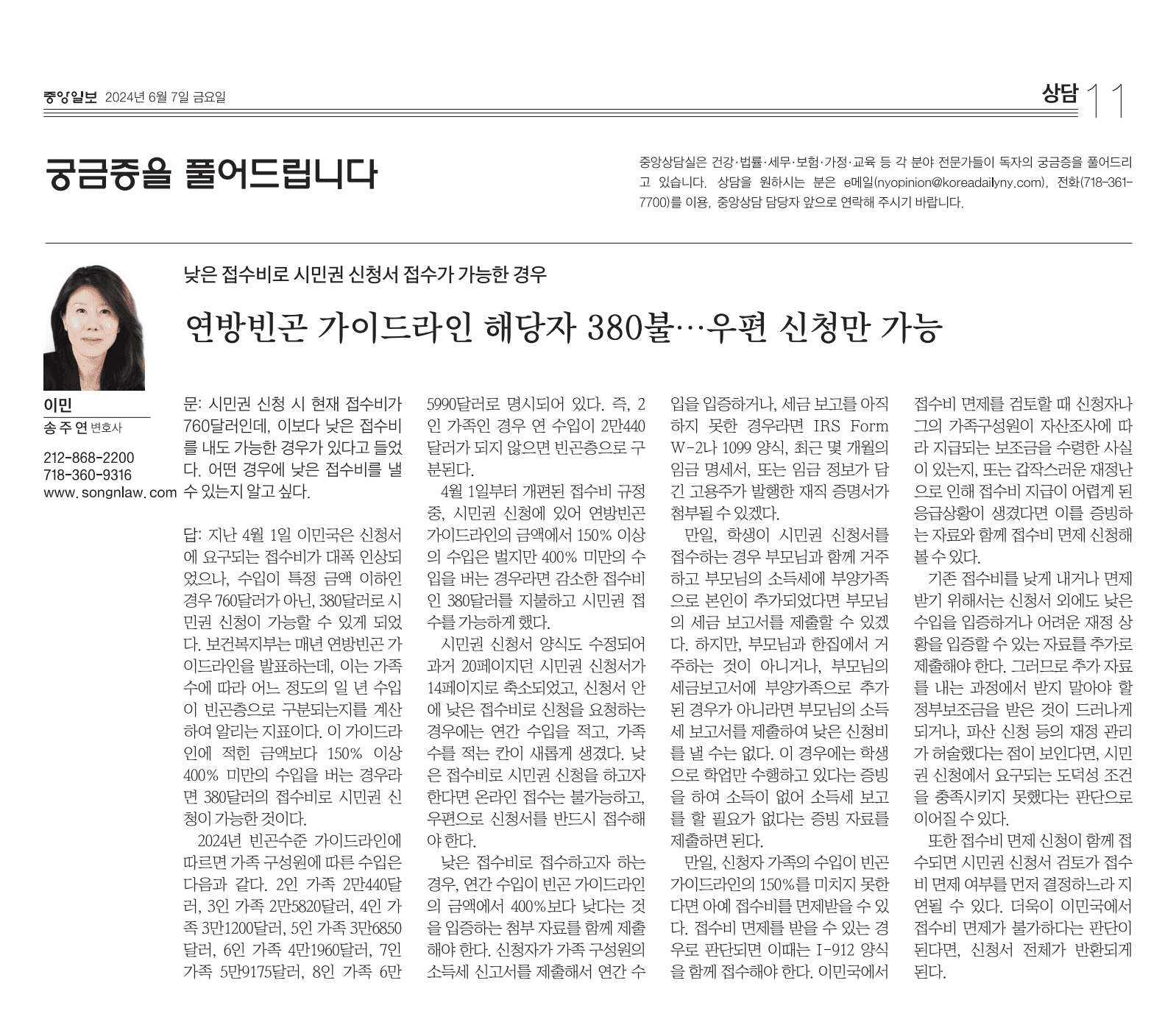 지난 4월 1일 이민국은 신청서에 요구되는 접수비가 대폭 인상되었으나, 수입이 특정 금액 이하인 경우 760달러가 아닌 380달러로 시민권 신청이 가능할 수 있게 되었다. 보건복지부는 매년 연방 빈곤 가이드라인을 발표하는데, 이는 가족 수에 따라 어느 정도의 1년 수입이 빈곤층으로 구분되는지를 계산하여 알리는 지표이다. 이 가이드라인에 적힌 금액보다 150% 이상 400% 미만의 수입을 버는 경우라면 380달러의 접수비로 시민권 신청이 가능한 것이다.