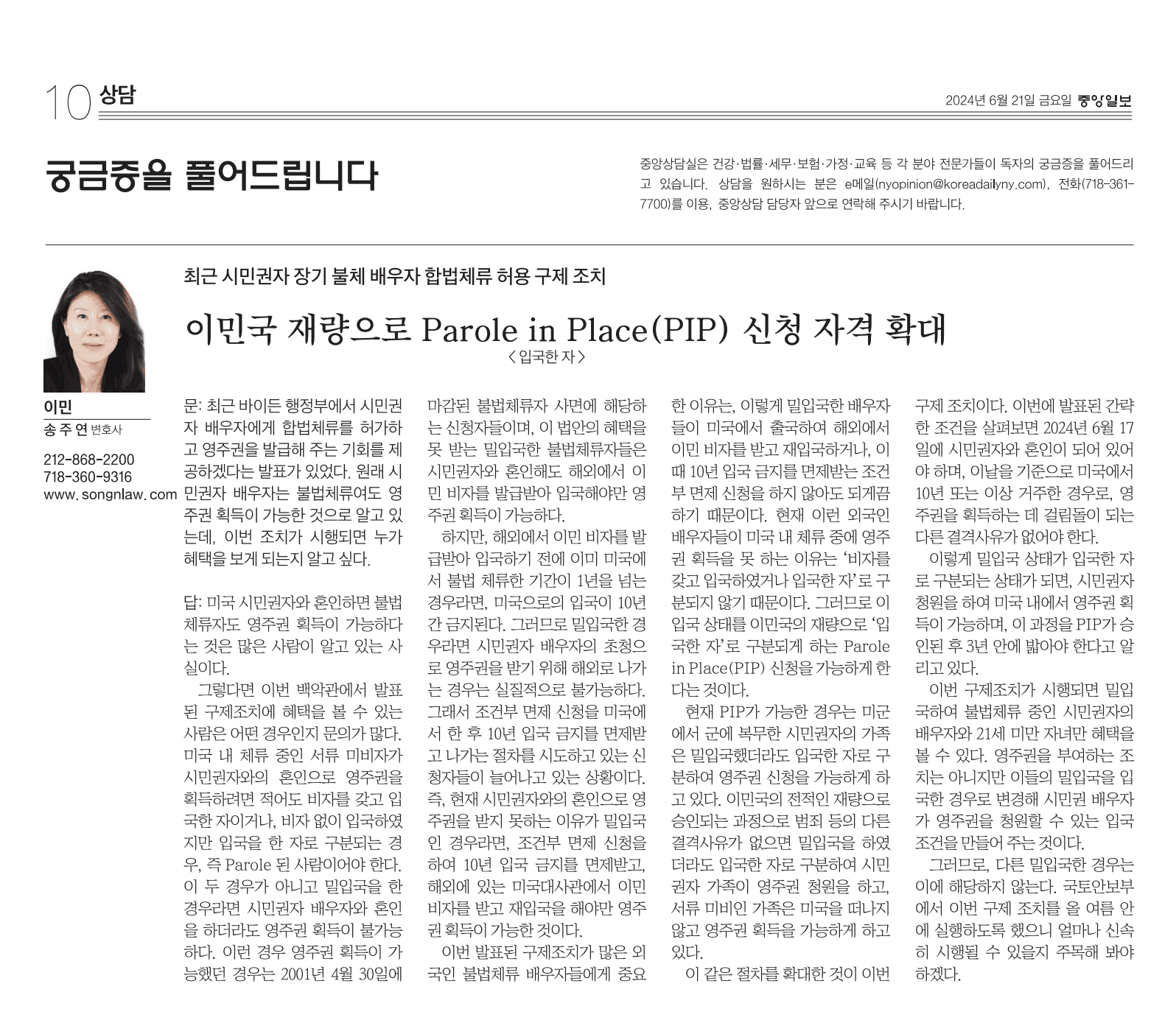 이번 발표된 구제 조치가 많은 외국인 불법 체류 배우자들에게 중요한 이유는, 이렇게 밀입국한 배우자들이 미국에서 출국하여 해외에서 이민 비자를 받고 재입국하거나, 이때 10년 입국 금지를 면제받는 조건부 면제 신청을 하지 않아도 되게끔 하기 때문이다. 현재 이런 외국인 배우자들이 미국 내 체류 중에 영주권 획득을 못하는 이유는 비자를 갖고 입국하였거나 입국한 자로 구분되지 않기 때문이다. 그러므로 이 입국 상태를 이민국의 재량으로 입국한 자로 구분되게 하는 Parole in Place(PIP) 신청을 가능하게 한다는 것이다.