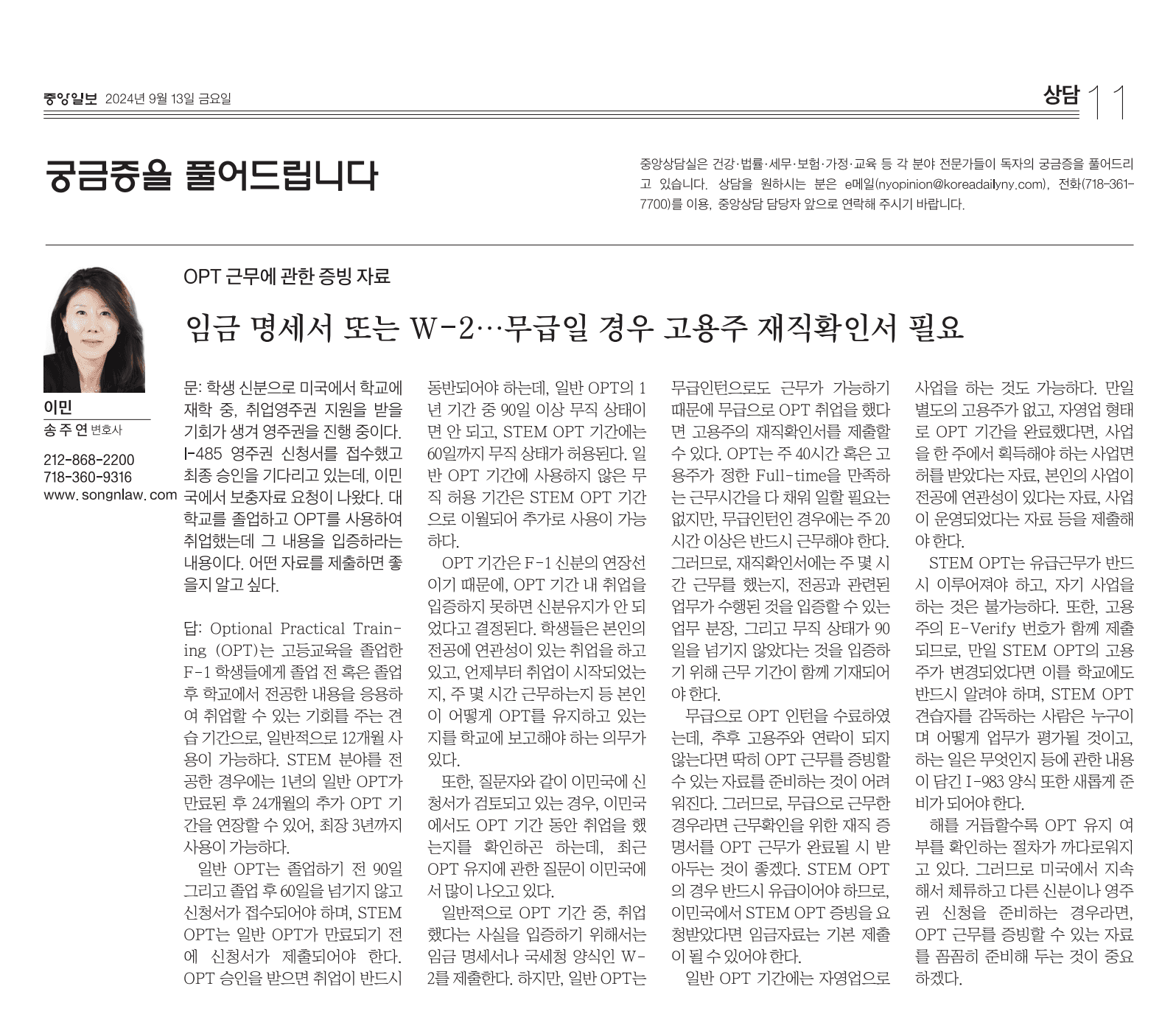 해를 거듭할수록 OPT 유지 여부를 확인하는 절차가 까다로워지고 있다. 그러므로 미국에서 지속해서 체류하고 다른 신분이나 영주권 신청을 준비하는 경우라면, OPT 근무를 증빙할 수 있는 자료를 꼼꼼히 준비해 두는 것이 중요하겠다.