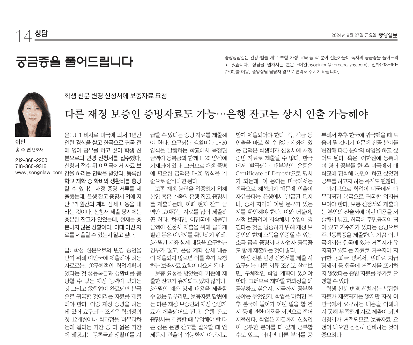 J-1 비자로 미국에 와서 1년간 인턴 경험을 쌓고 한국으로 귀국 전에 영어 공부를 하고 싶어 학생 신분으로의 변경 신청서를 접수했다. 신청서 접수 뒤 이민국에서 자료 보강을 하라는 연락을 받았다. 등록한 학교 재학 중 학비와 생활비를 충당할 수 있다는 재정 증명 서류를 제출했는데, 은행 잔고 증명서 외에 지난 3개월간의 계좌 상세 내용을 내라는 것이다. 신청서 제출 당시에는 충분한 잔고가 있었는데, 현재는 충분하지 않은 상황이다. 이때 어떤 자료를 제출할 수 있는지 알고 싶다.