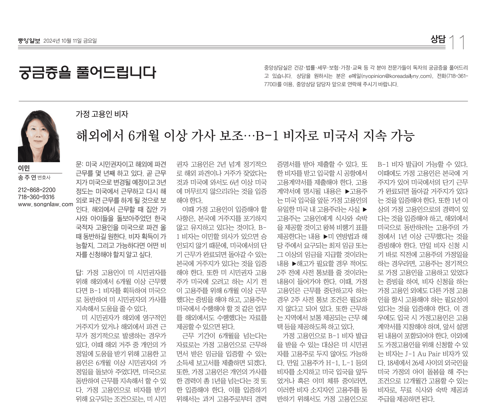 가정 고용인이 미 시민권자를 위해 해외에서 6개월 이상 근무했다면 B-1 비자를 획득하여 미국으로 동반하여 미 시민권자의 가사를 지속해서 도움을 줄 수 있다.