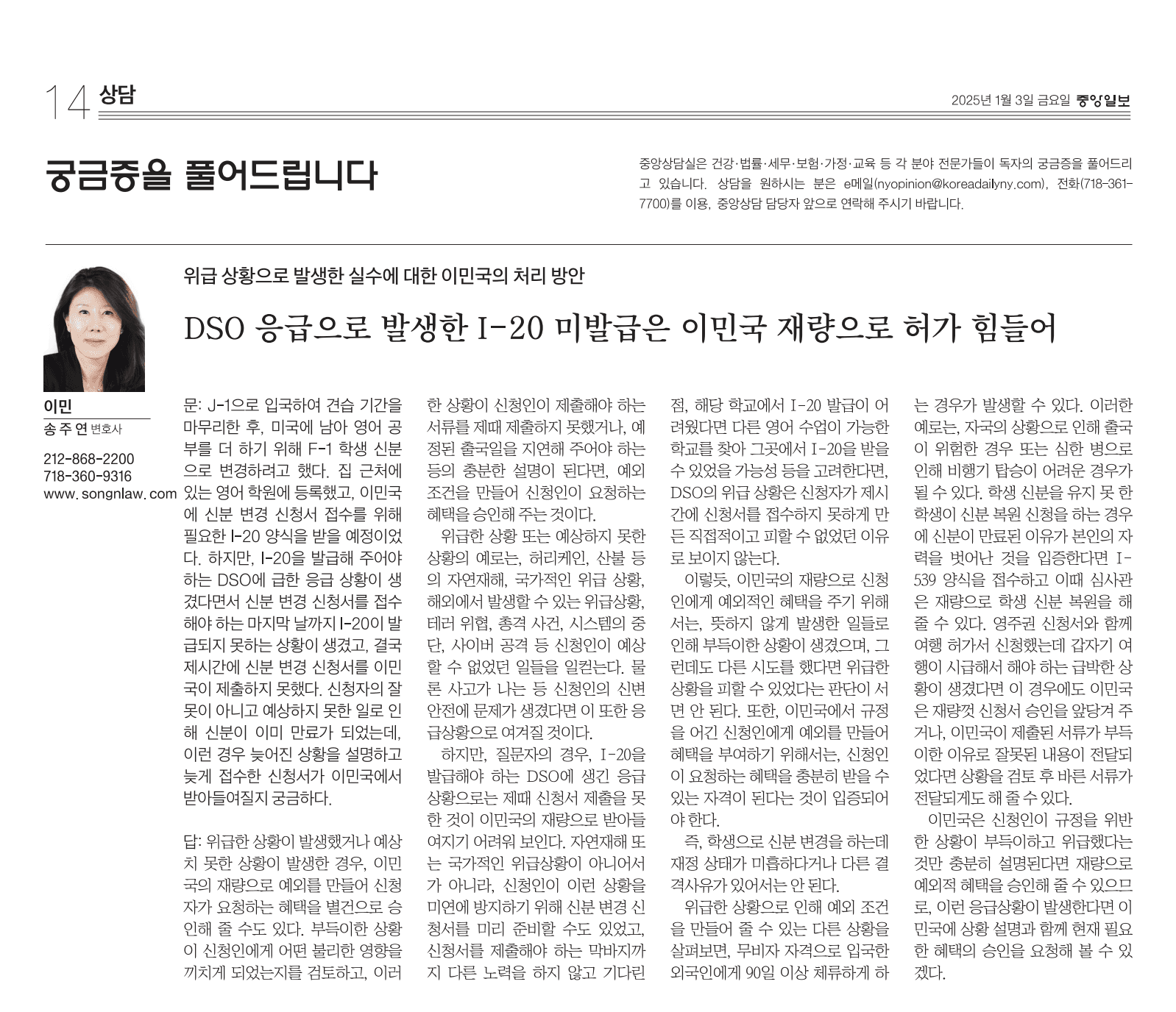 J-1으로 입국하여 견습 기간을 마무리한 후, 미국에 남아 영어 공부를 더 하기 위해 F-1 학생 신분으로 변경하려고 했다. 집 근처에 있는 영어 학원에 등록했고, 이민국에 신분 변경 신청서 접수를 위해 필요한 I-20 양식을 받을 예정이었다. 하지만, I-20을 발급해 주어야 하는 DSO에 급한 응급 상황이 생겼다면서 신분 변경 신청서를 접수해야 하는 마지막 날까지 I-20이 발급되지 못하는 상황이 생겼고, 결국 제시간에 신분 변경 신청서를 이민국에 제출하지 못했다. 신청자의 잘못이 아니고 예상하지 못한 일로 인해 신분이 이미 만료가 되었는데, 이런 경우 늦어진 상황을 설명하고 늦게 접수한 신청서가 이민국에서 받아들여질지 궁금하다.