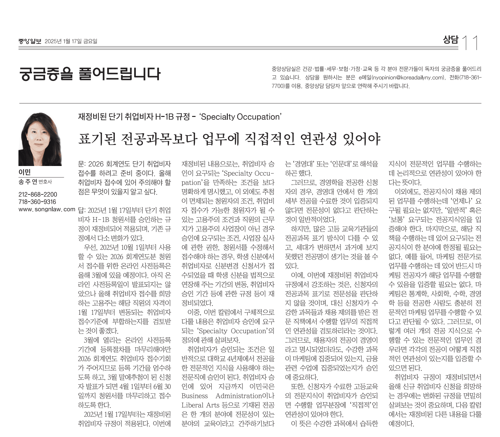 이중, 이번 칼럼에서 구체적으로 다룰 내용은 취업비자 승인에 요구되는 ‘Specialty Occupation’의 정의에 관해 살펴보자.