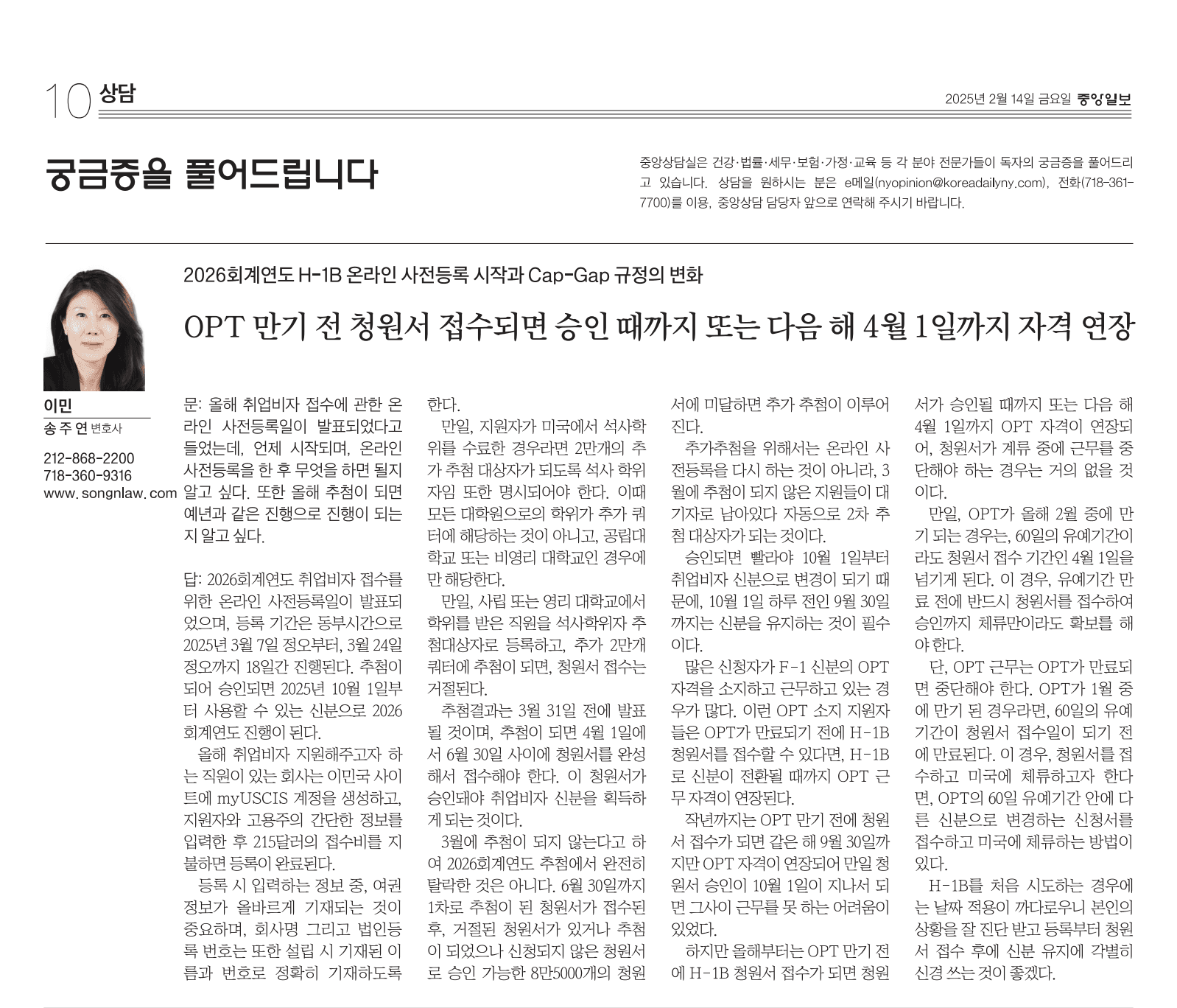 2026회계연도 H-1B 온라인 사전등록 시작과 Cap-Gap 규정의 변화