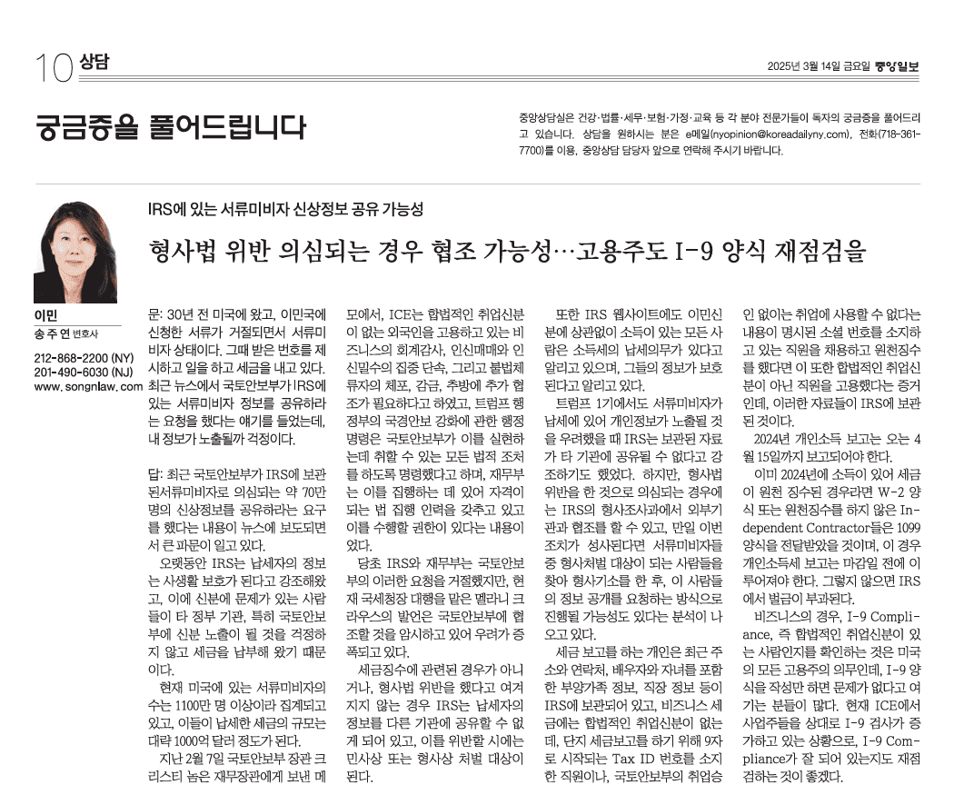 30년 전 미국에 왔고, 이민국에 신청한 서류가 거절되면서 서류미비자 상태이다. 그때 받은 번호를 제시하며 일을 하고 세금을 내고 있다. 최근 뉴스를에서 국토안보부가 IRS에 있는 서류미비자 정보를 공유하라는 요청을 했다는 얘기를 들었는데, 내 정보가 노출될까 걱정이다.