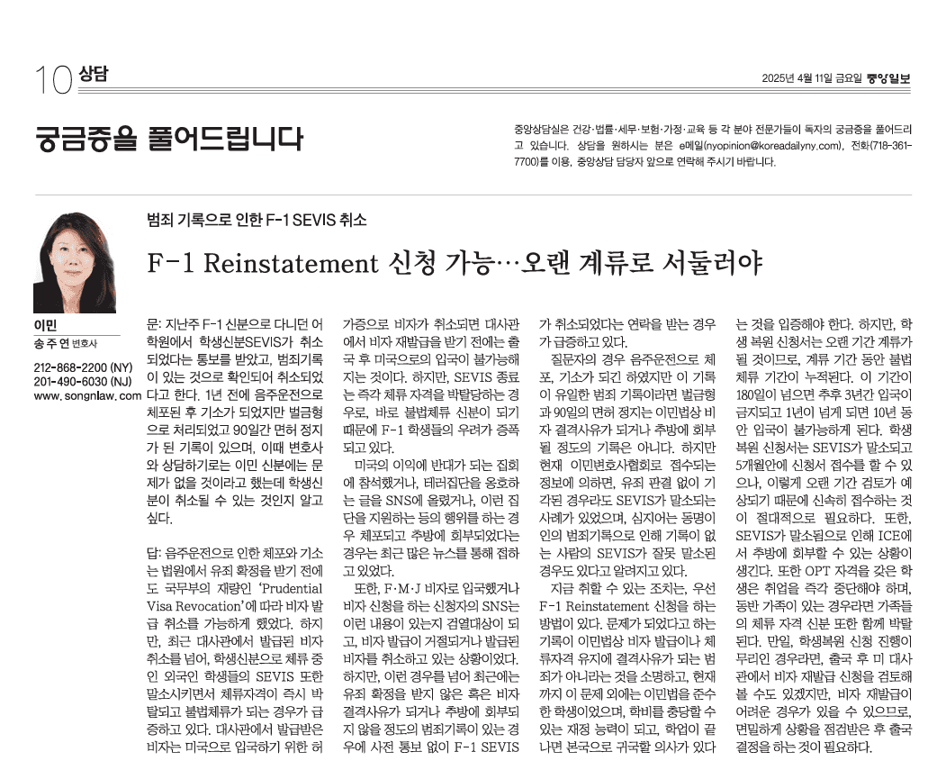 지난주 F-1 신분으로 다니던 어학원에서 학생신분SEVIS가 취소되었다는 통보를 받았고, 범죄기록이 있는 것으로 확인되어 취소되었다고 한다. 1년 전에 음주운전으로 체포된 후 기소가 되었지만 범금형으로 처리되었고 90일간 면허 정지가 된 기록이 있으며, 이때 변호사와 상담하기로는 이민 신분에는 문제가 없을 것이라 했는데 학생 신분이 취소될 수 있는 것인지 알고 싶다.