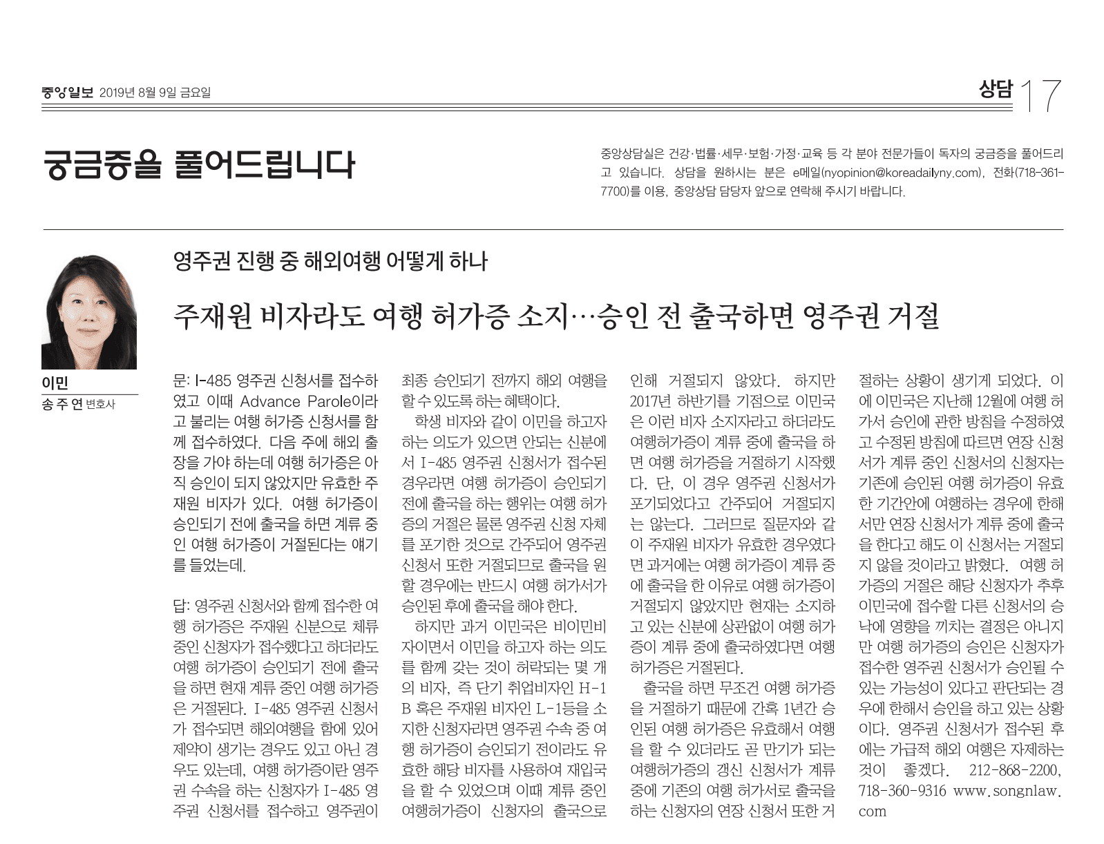 따라서 영주권 신청서가 접수된 후에는 가급적 해외여행을 자제하는 것이 좋겠다.