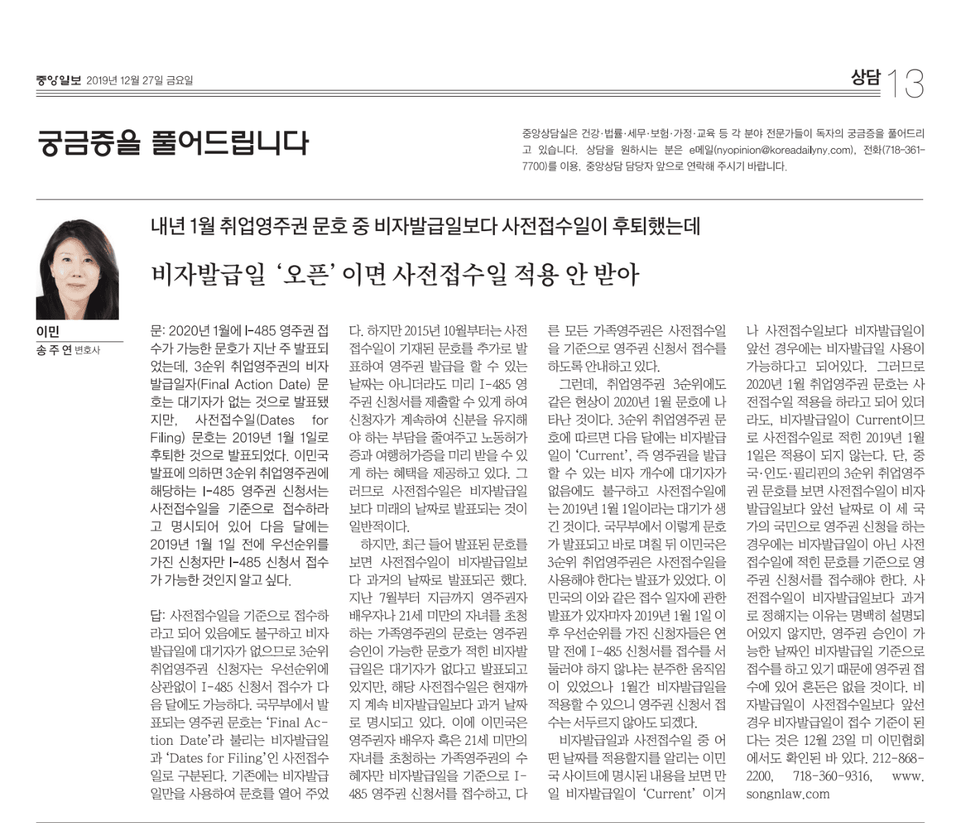 이민국 발표에 따르면 3순위 취업영주권에 해당하는 I-485 영주권 신청서는 사전접수일을 기준으로 접수하라고 명시되어 있어, 다음 달에는 2019년 1월 1일 전에 우선순위를 가진 신청자만 I-485 신청서 접수가 가능한 것인지 알고 싶다.