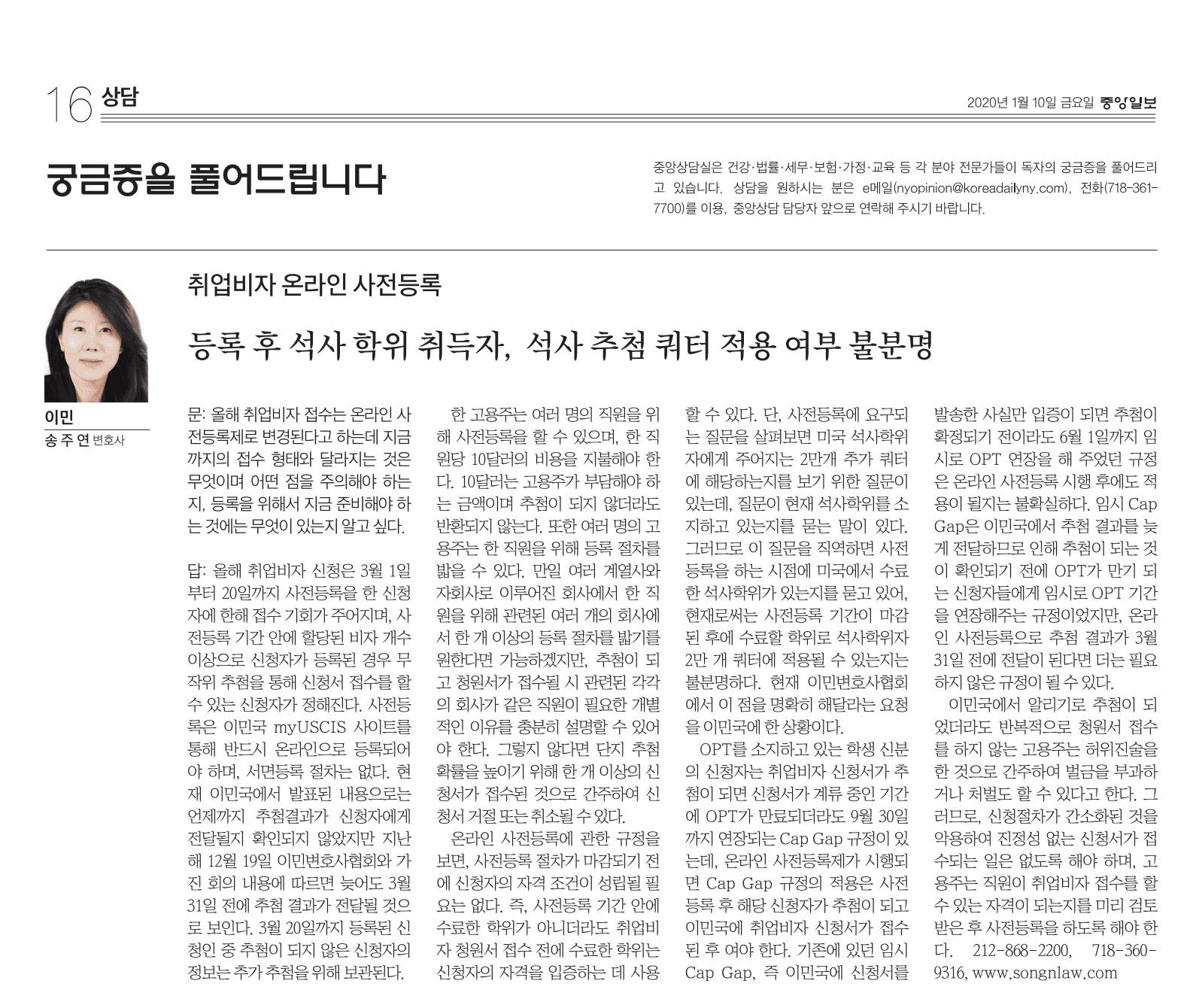 하지만 온라인 사전등록제가 시행되면 Cap-Gap 규정의 적용은 사전등록 후 해당 신청자가 추첨되고, 이민국에 취업비자 신청서가 접수된 후에만 가능 하다.