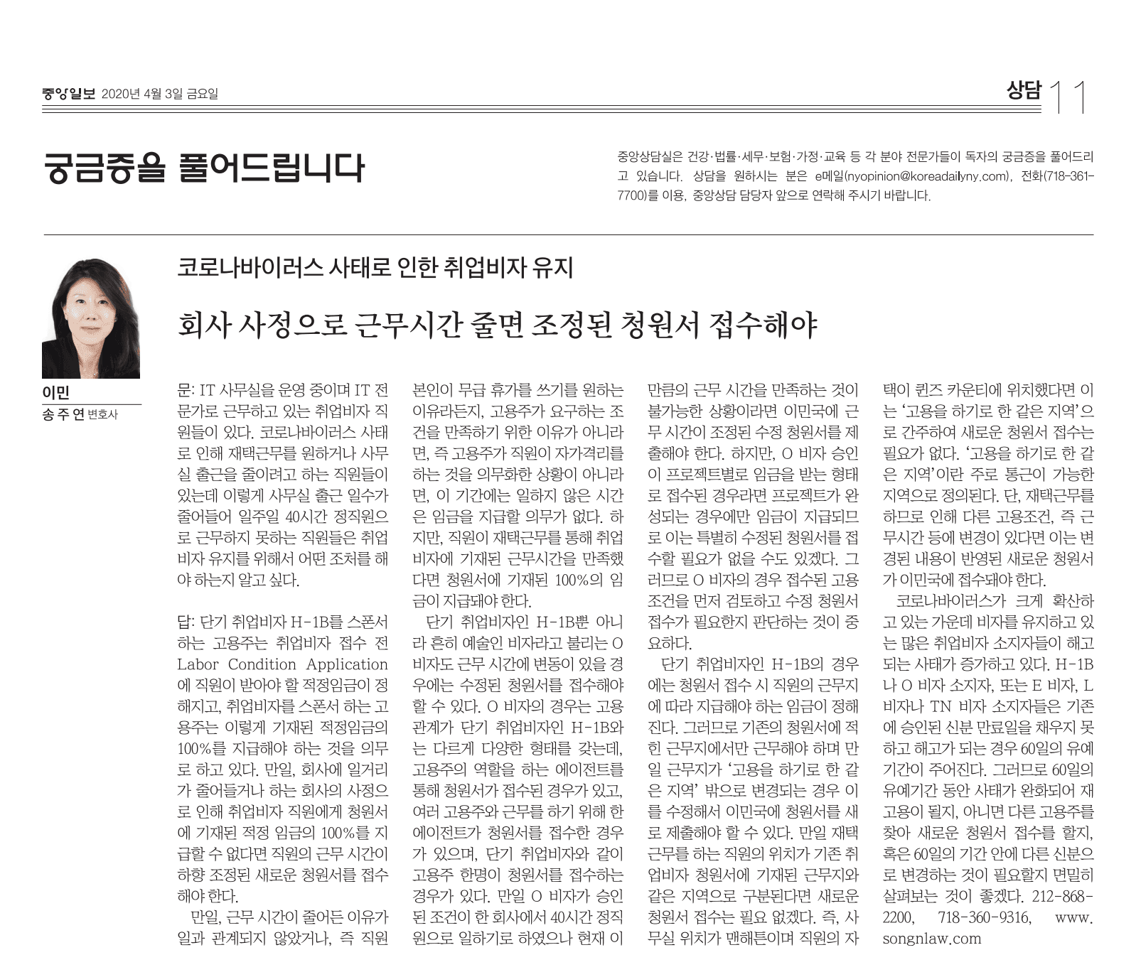 IT 사무실을 운영 중이며 IT 전문가로 근무하고 있는 취업비자 직원들이 있다. 코로나바이러스 사태로 인해 재택근무를 원하거나 사무실 출근을 줄이려고 하는 직원들이 있는데 이렇게 사무실 출근 일수가 줄어들어 일주일 40시간 정직원으로 근무하지 못하는 직원들은 취업비자 유지를 위해서 어떤 조처를 해야 하는지 알고 싶다.