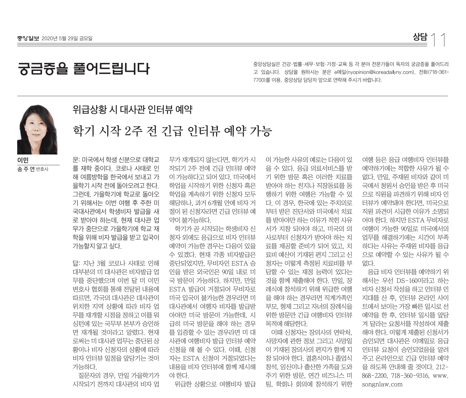 지난 3월 코로나 사태로 인해 대부분의 미 대사관은 비자 발급 업무를 중단했으며, 이번 달 미 이민 변호사 협회를 통해 전달된 내용에 따르면, 각국의 대사관은 대사관이 위치한 지역 상황에 따라 비자 업무를 재개할 시점을 정하고 이를 워싱턴에 있는 국무부 본부가 승인하면 재개될 것이라고 알렸다. 현재로써는 미 대사관 업무는 중단된 상황이나 비자 신청자의 상황에 따라 비자 인터뷰 일정을 앞당기는 것이 가능하다.