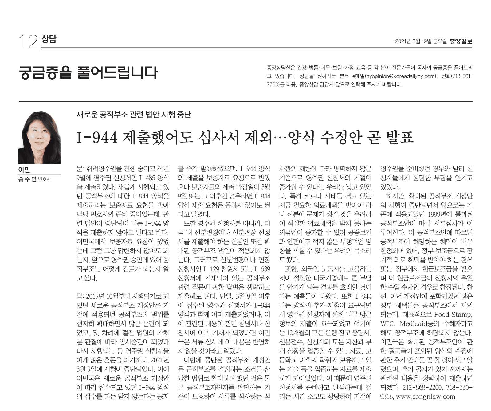 2019년 10월부터 시행되기로 했던 새로운 공적부조 개정안은 기존에 적용되던 공적부조의 범위를 현저히 확대하면서 많은 논란이 되었고, 몇 차례에 걸친 법원의 가처분 판결에 따라 임시 중단되었다가 다시 시행되는 등 영주권 신청자들에게 많은 혼란을 야기했다. 그러다 2021년 3월 9일에 시행이 중단되었다. 이에 이민국은 새로운 공적부조 개정안에 따라 접수되고 있던 I-944 양식의 접수를 더는 받지 않는다는 공지를 즉각 발표하였으며, I-944 양식의 제출을 보충자료 요청으로 받았으나 보충자료의 제출 마감일이 3월 9일 또는 그 이후인 경우라면 I-944 양식 제출 요청에는 응하지 않아도 된다고 알렸다.