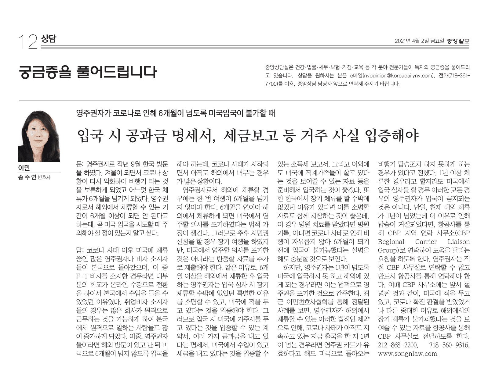 이 중 영주권자라면 해외 방문 후 6개월 이내에 미국으로 입국해야 한다. 그러나 코로나 사태가 시작된 이후 아직도 해외에서 장기 체류 중인 영주권자들이 많은 상황이다.