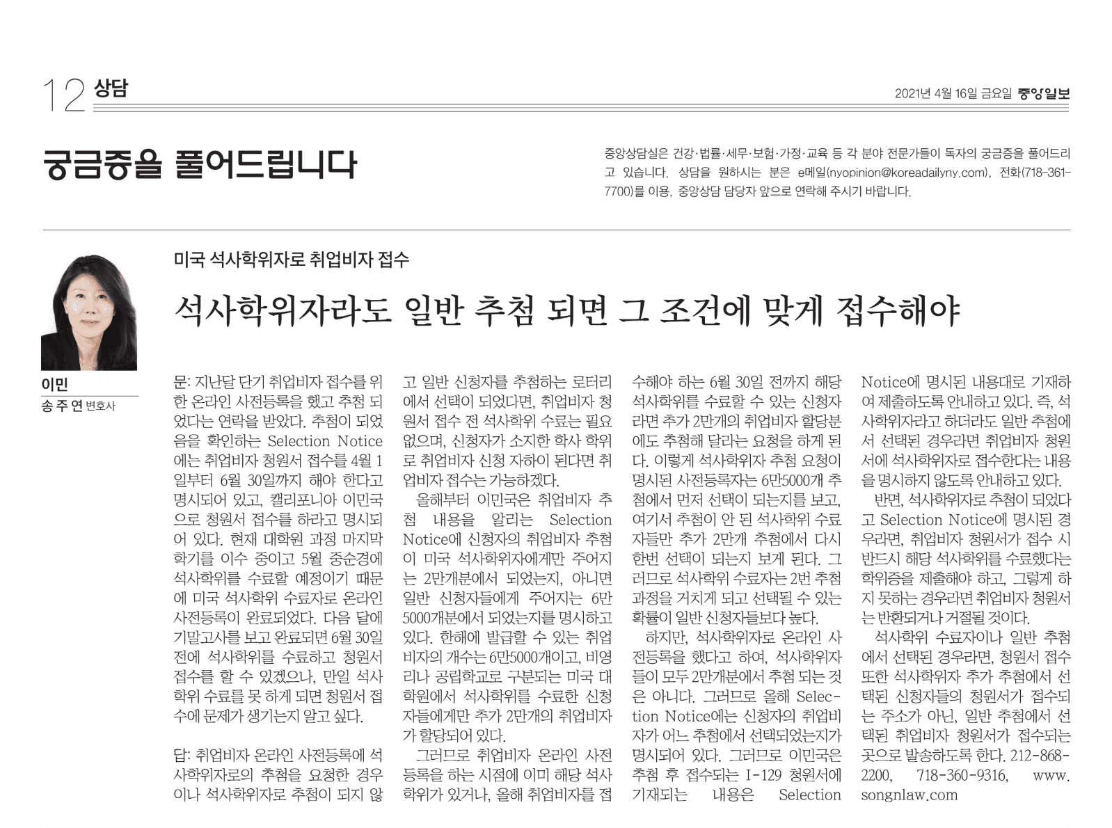 따라서 취업비자 온라인 사전 등록 시, 이미 석사 학위를 소지했거나, 6월 30일 이전에 석사 학위를 수료할 예정인 신청자는, “석사 학위자 추가 2만 개 할당분에도 포함하여 추첨해 달라”는 요청을 하게 된다.