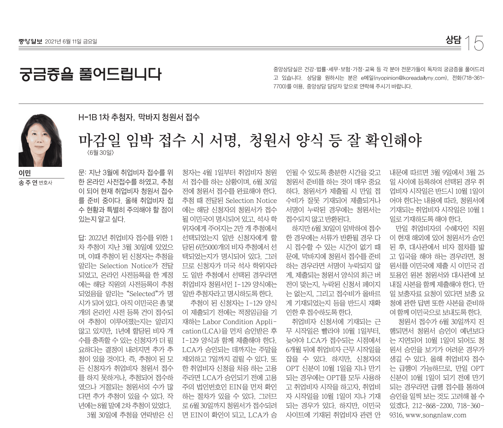 추첨이 된 신청자는 I-129 양식이 제출되기 전에 적정 임금을 기재하는 **Labor Condition Application(LCA)**을 먼저 승인받은 후 I-129 양식과 함께 제출해야 한다. LCA가 승인되는 데까지는 주말을 제외하고 최대 7일까지 걸릴 수 있다. 또한, 취업비자 신청을 처음 하는 고용주라면 LCA가 승인되기 전에 고용주의 법인번호인 EIN을 먼저 확인하는 절차가 있을 수 있다. 그러므로 6월 30일까지 청원서가 접수되려면 EIN이 확인되고, LCA가 승인될 수 있도록 충분한 시간을 갖고 청원서를 준비하는 것이 매우 중요하다.