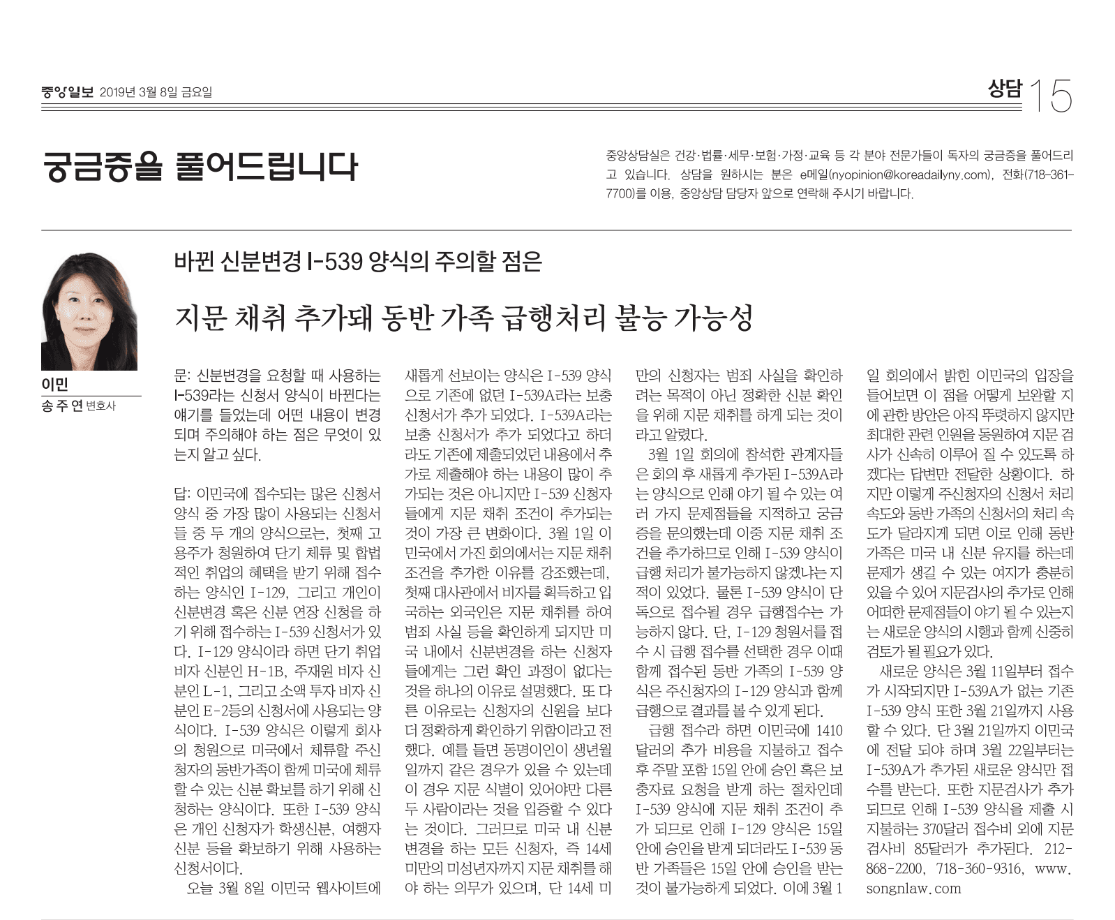 신분 변경을 요청할 때 사용하는 I-539라는 신청서 양식이 바뀐다는 얘기를 들었는데 어떤 내용이 변경되며 주의해야 하는 점은 무엇이 있는지 알고 싶다.