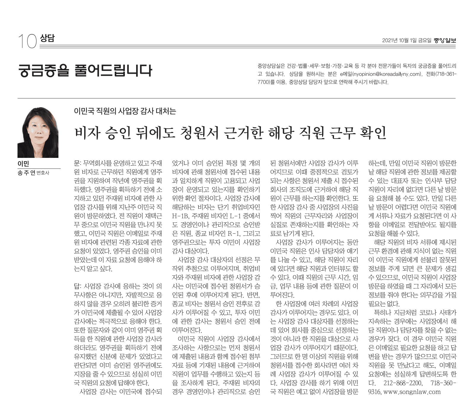 사업장 감사에 응하는 것이 의무 사항은 아니지만, 자발적으로 응하지 않을 경우 오히려 불리한 증거가 이민국에 제출될 수 있어 사업장 감사에는 적극적으로 응해야 한다. 또한 질문자와 같이 이미 영주권을 획득한 직원에 관한 사업장 감사라 하더라도, 영주권을 획득하기 전에 유지했던 신분에 문제가 있었다고 판단되면 이미 승인된 영주권에도 지장을 줄 수 있으므로 성실히 이민국 직원의 요청에 답해야 한다.