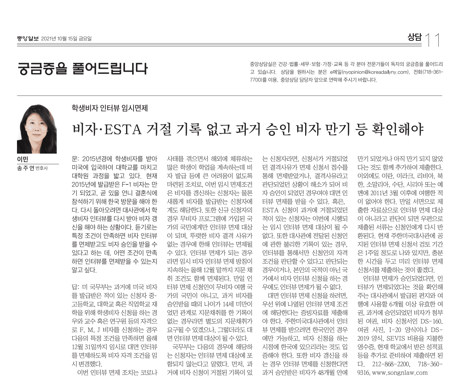 2015년경에 학생비자를 받아 미국에 입국하여 대학교를 마치고 대학원 과정을 밟고 있다. 현재 2015년에 발급받은 F-1 비자는 만기되었고, 곧 있을 언니 결혼식에 참석하기 위해 한국 방문을 해야 한다. 다시 돌아오려면 대사관에서 학생비자 인터뷰를 다시 받아 비자 갱신을 해야 하는 상황이다. 듣기로는 특정 조건이 만족하면 비자 인터뷰를 면제받고도 비자 승인을 받을 수 있다고 하는데, 어떤 조건이 만족하면 인터뷰를 면제받을 수 있는지 알고 싶다.
