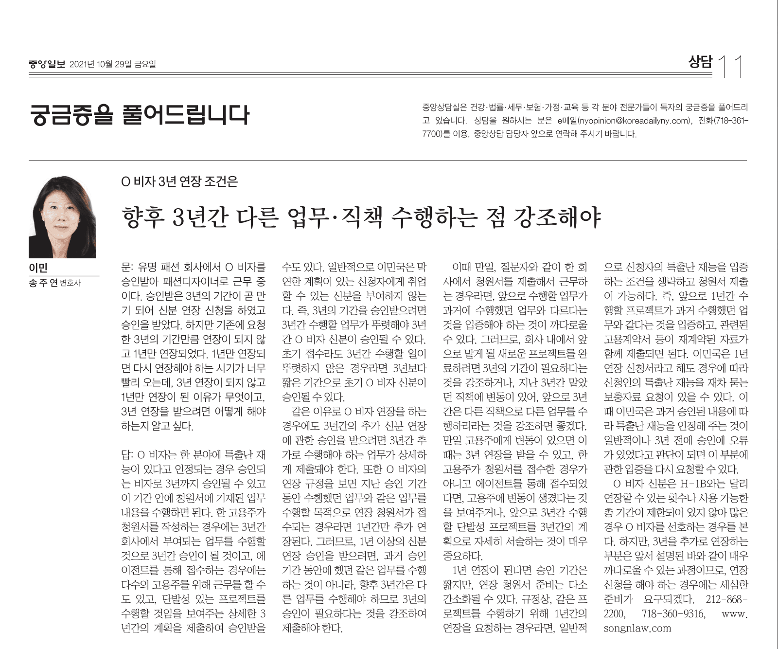 O 비자 신분은 H-1B와는 달리 연장할 수 있는 횟수나 사용 가능한 총 기간이 제한되어 있지 않아 많은 경우 O 비자를 선호하는 경우를 본다. 하지만, 3년을 추가로 연장하는 부분은 앞서 설명된 바와 같이 매우 까다로울 수 있는 과정이므로, 연장 신청을 해야 하는 경우에는 세심한 준비가 요구되겠다.