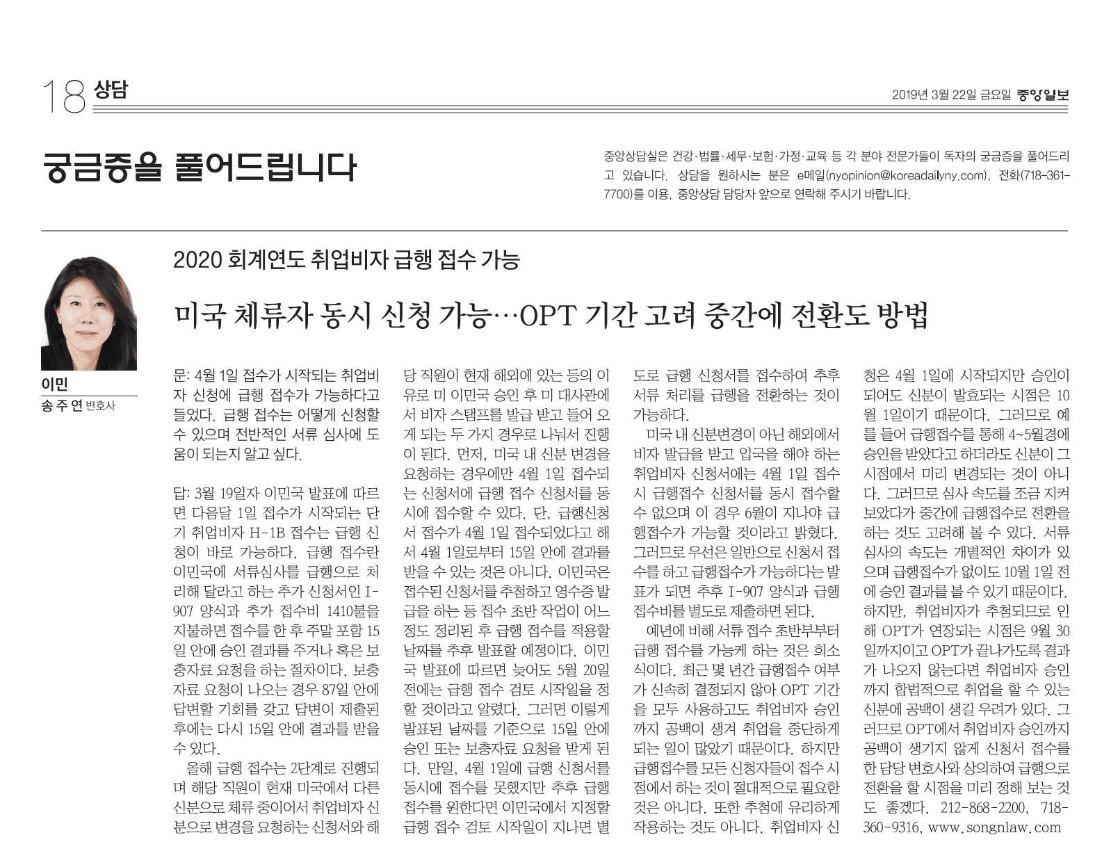 따라서, OPT에서 취업비자 승인까지 공백이 생기지 않도록, 신청서를 접수한 담당 변호사와 상의하여 급행 접수로 전환할 시점을 미리 정하는 것도 좋은 방법이다.