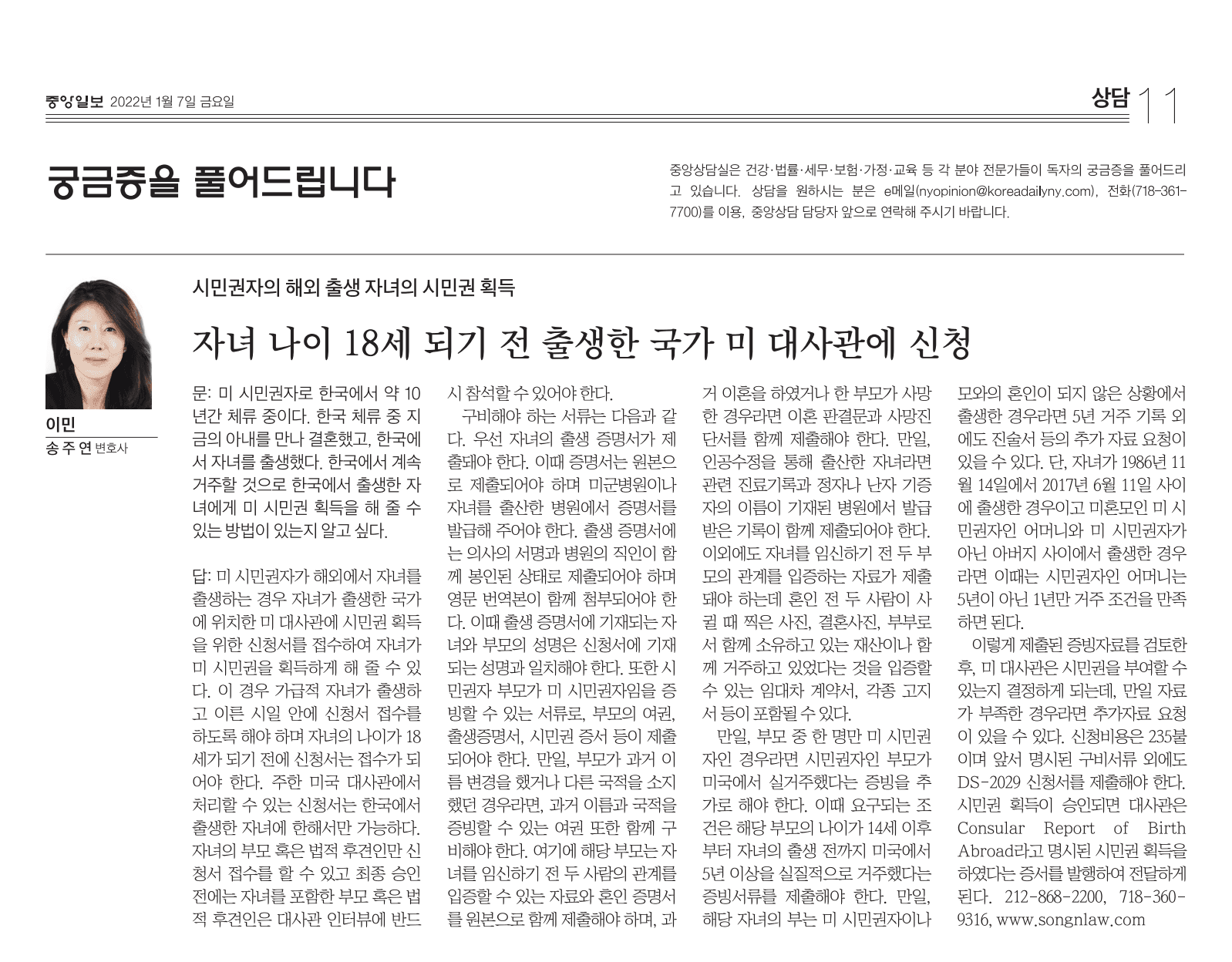 미 시민권자로 한국에서 약 10년간 체류 중이다. 한국 체류 중 지금의 아내를 만나 결혼했고, 한국에서 자녀를 출생했다. 한국에서 계속 거주할 것으로 한국에서 출생한 자녀에게 미 시민권 획득을 해 줄 수 있는 방법이 있는지 알고 싶다.