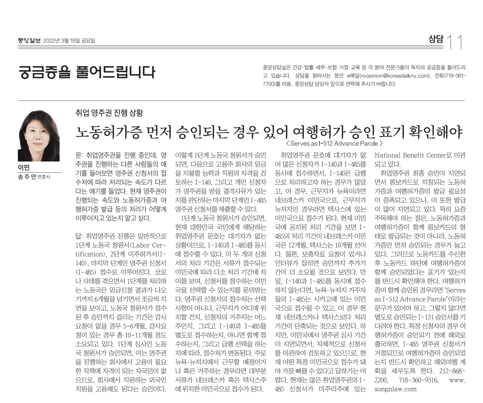 그러므로 노동카드를 수신한 후 노동카드 하단에 여행허가증이 함께 승인되었다는 표기가 있는지 반드시 확인해야 한다. 여행허가증이 함께 승인된 경우라면 ‘Serves as I-512 Advance Parole’이라는 문구가 있어야 하고, 그렇지 않다면 별도로 승인되는 I-131 승인서를 기다려야 한다. 특정 신청자의 경우 여행허가증이 승인되기 전에 해외로 출국하면, I-485 영주권 신청서가 거절되므로 여행허가증이 승인되었는지 반드시 확인하고 해외여행 계획을 세우도록 한다.