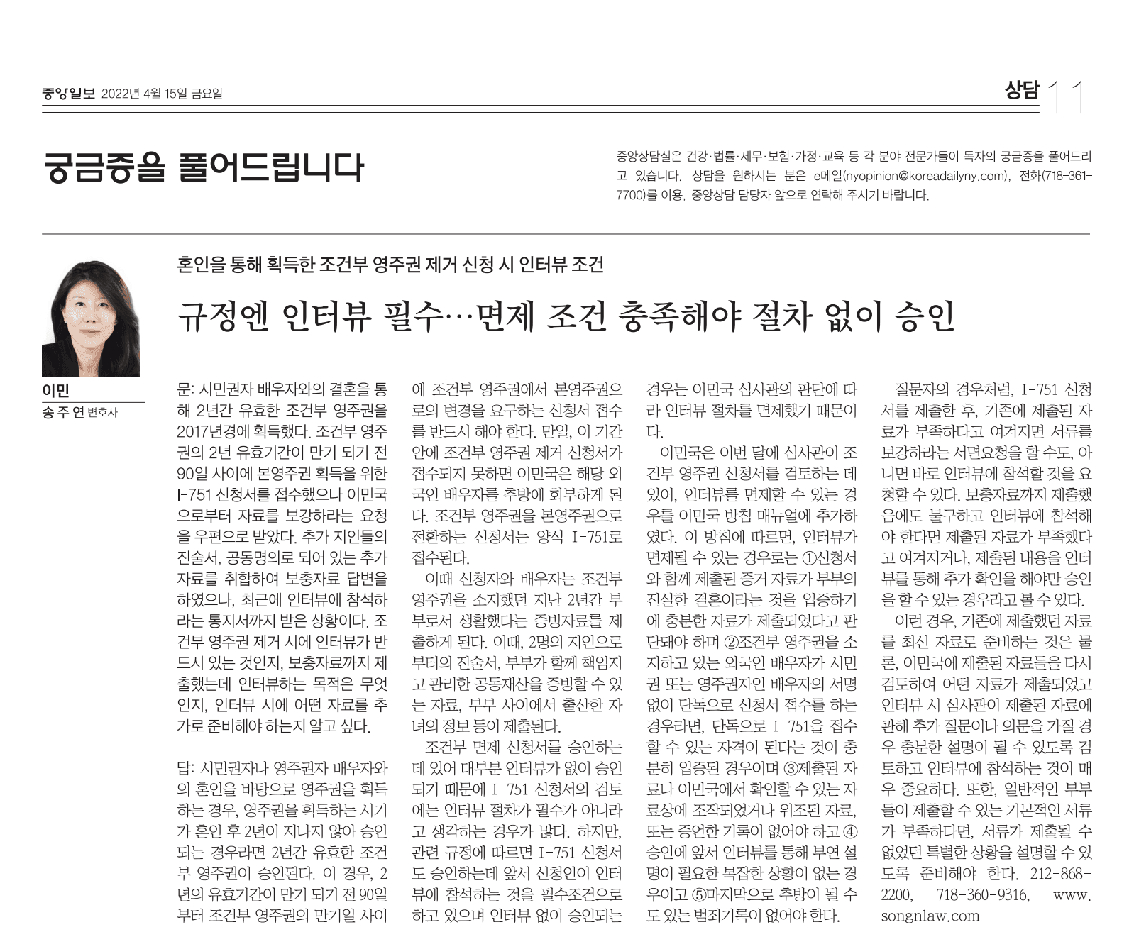 시민권자 배우자와의 결혼을 통 해 2년간 유효한 조건부 영주권을 2017년경에 획득했다. 조건부 영주권의 2년 유효기간이 만기 되기 전 90일 사이에 본영주권 획득을 위한 I-751 신청서를 접수했으나 이민국으로부터 자료를 보강하라는 요청을 우편으로 받았다. 추가 지인들의 진술서, 공동명의로 되어 있는 추가 자료를 취합하여 보충자료 답변을 하였으나, 최근에 인터뷰에 참석하 라는 통지서까지 받은 상황이다. 조건부 영주권 제거시에 인터뷰가 반드시 있는 것인지, 보충자료까지 제출했는데 인터뷰하는 목적은 무엇인지, 인터뷰 시에 어떤 자료를 추가로 준비해야하는지 알고 싶다.