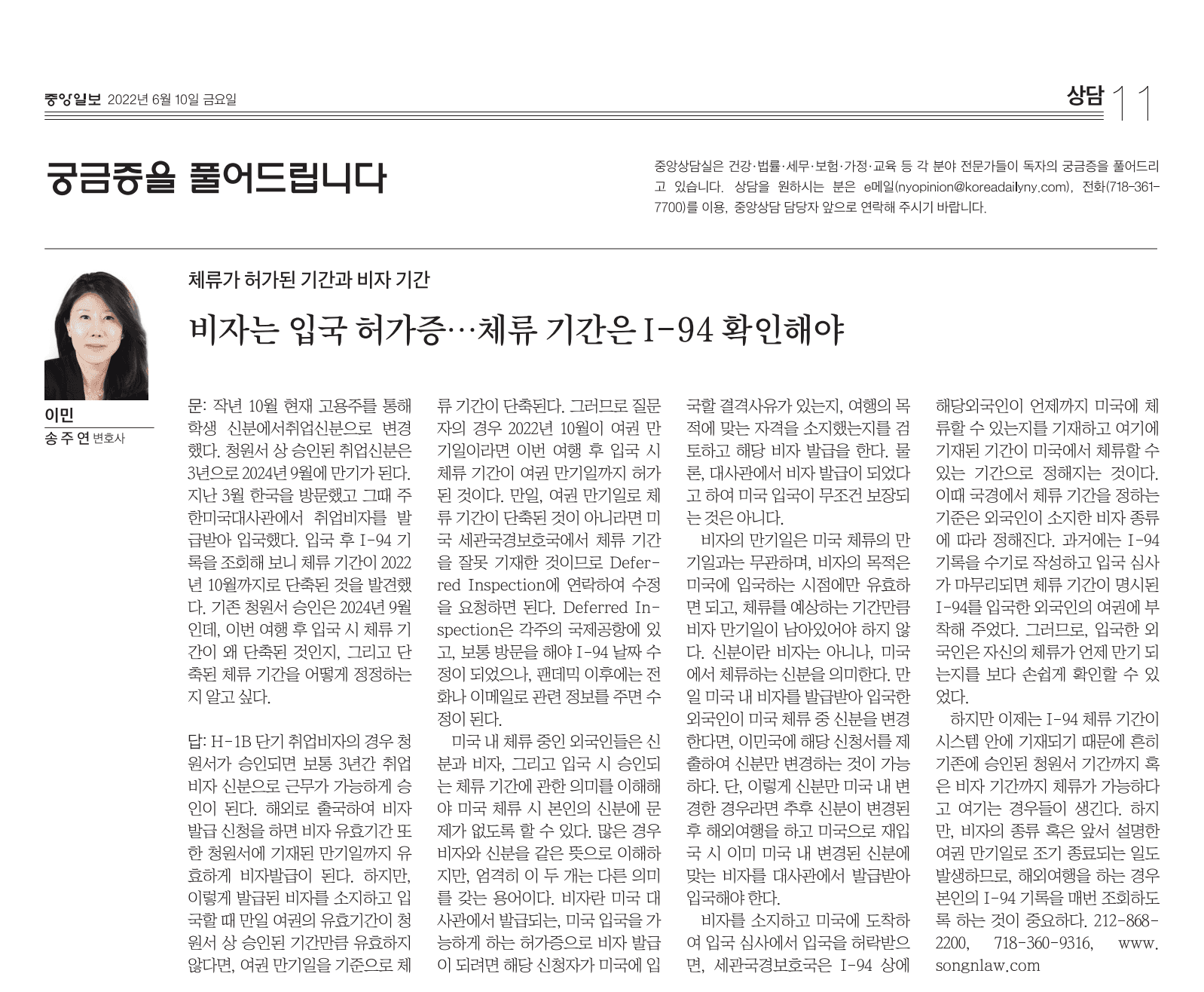 작년 10월 현재 고용주를 통해 학생 신분에서 취업 신분으로 변경했다. 청원서 승인된 취업 신분은 3년으로 2024년 9월에 만기가 된다. 지난 3월 한국을 방문했고 그때 주한 미국 대사관에서 취업 비자를 발급받아 입국했다. 입국 후 I-94 기록을 조회해 보니 체류 기간이 2022년 10월까지로 단축된 것을 발견했다. 기존 청원서 승인은 2024년 9월인데, 이번 여행 후 입국 시 체류 기간이 왜 단축된 것인지, 그리고 단축된 체류 기간을 어떻게 정정하는지 알고 싶다.