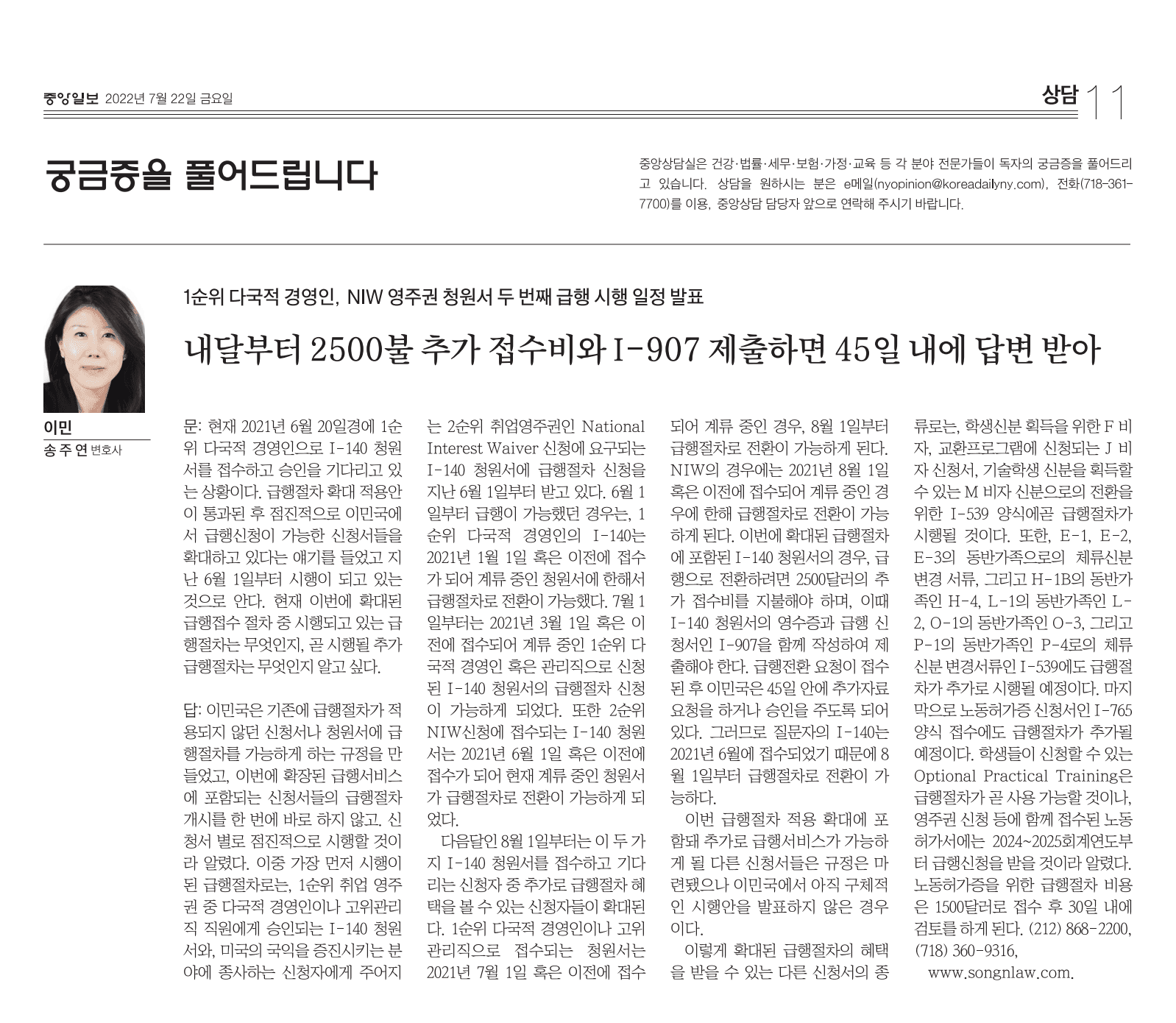 현재 2021년 6월 20일경에 1순위 다국적 경영인으로 I-140 청원서를 접수하고 승인을 기다리고 있는 상황이다. 급행 절차 확대 적용안이 통과된 후 점진적으로 이민국에서 급행 신청이 가능한 신청서들을 확대하고 있다는 얘기를 들었고 지난 6월 1일부터 시행이 되고 있는 것으로 안다. 현재 이번에 확대된 급행 접수 절차 중 시행되고 있는 급행 절차는 무엇인지, 곧 시행될 추가 급행 절차는 무엇인지 알고 싶다.