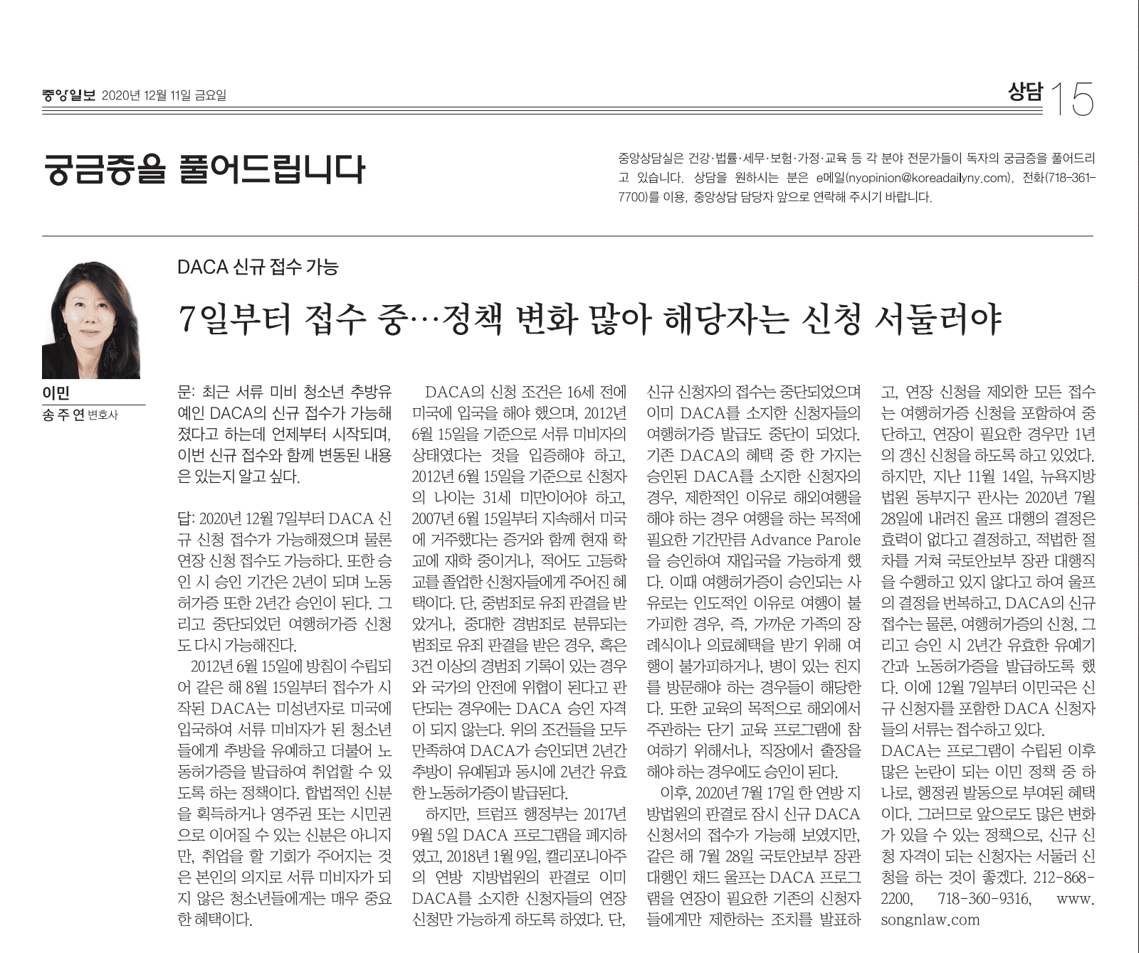 최근 서류 미비 청소년 추방 유예인 DACA의 신규 접수가 가능해졌다고 하는데 언제부터 시작되며, 이번 신규 접수와 함께 변동된 내용은 있는지 알고 싶다.