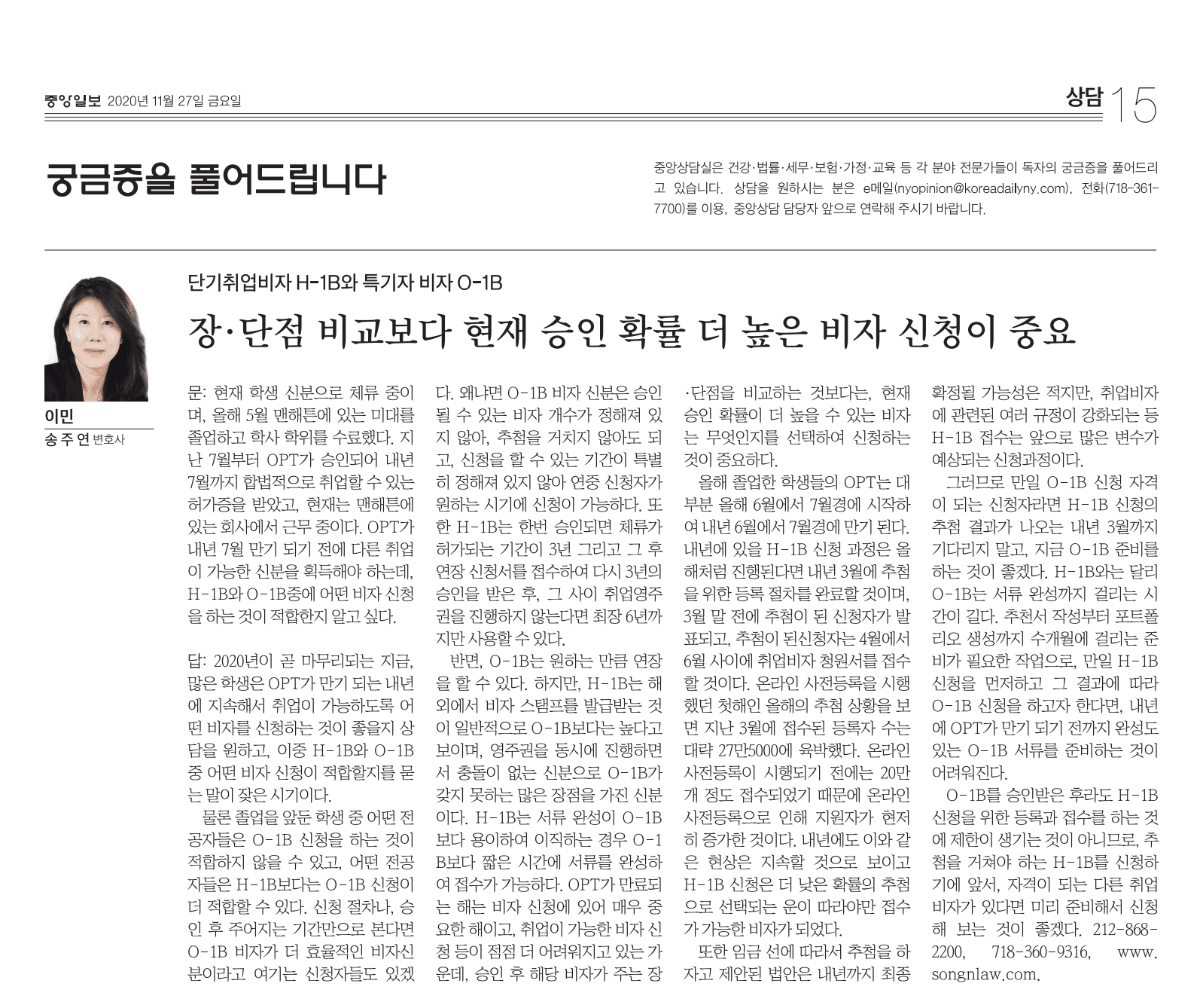 지난 7월부터 OPT가 승인되어 내년 7월까지 합법적으로 취업할 수 있는 허가증을 받았고, 현재는 맨해튼에 있는 회사에서 근무 중이다. OPT가 내년 7월 만기되기 전에 다른 취업이 가능한 신분을 획득해야 하는데, H-1B와 O-1B 중에 어떤 비자 신청을 하는 것이 적합한지 알고 싶다.