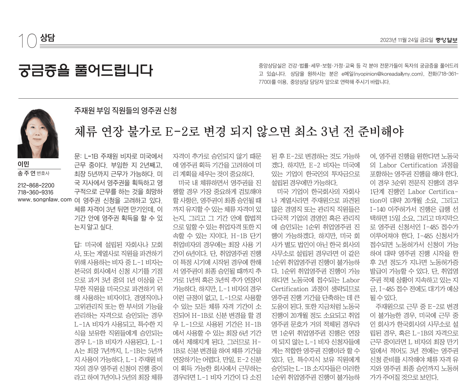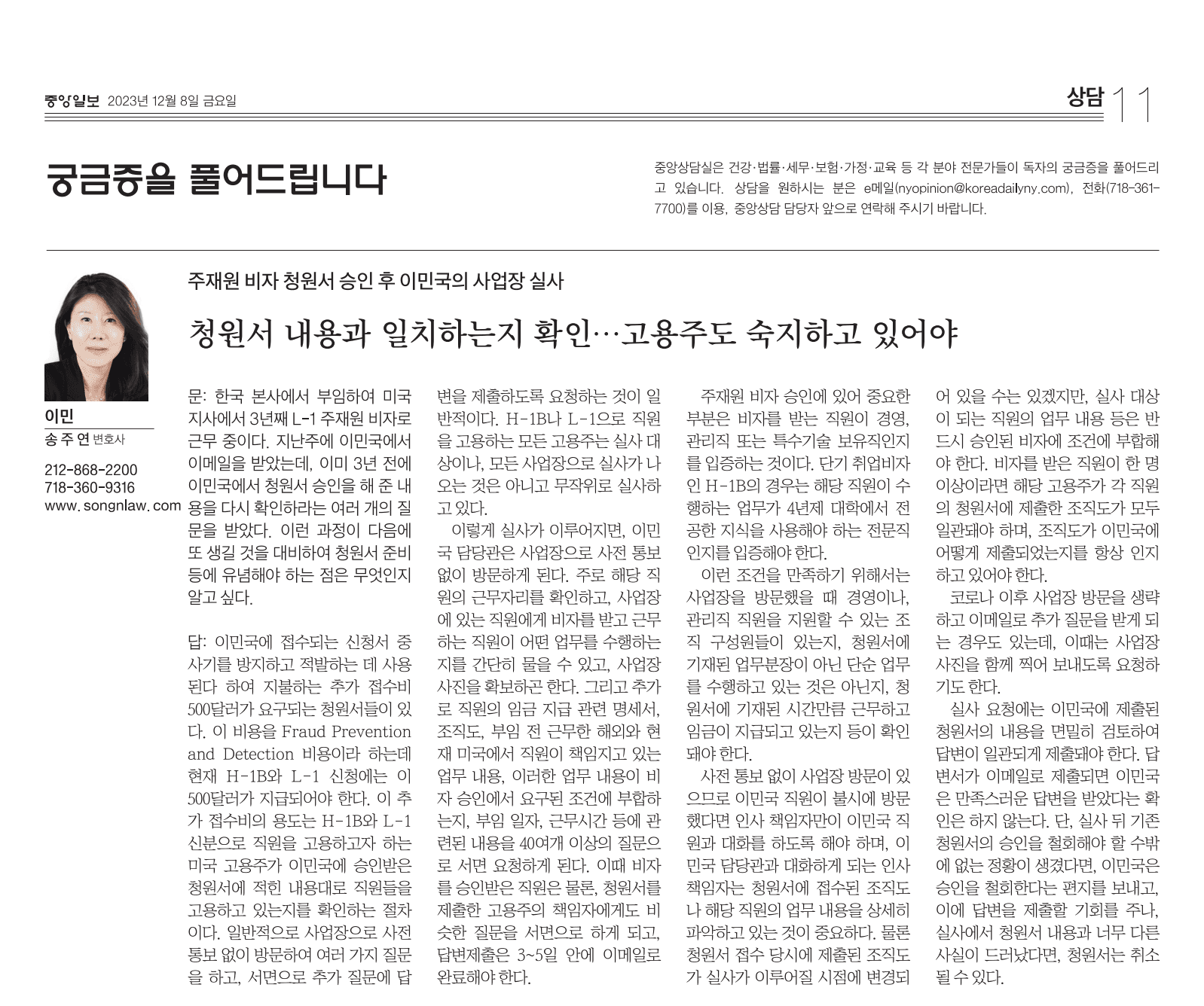 한국 본사에서 부임하여 미국 지사에서 3년째 L-1 주재원 비자로 근무 중이다. 지난주에 이민국에서 이메일을 받았는데, 이미 3년 전에 이민국에서 청원서 승인을 해 준 내용을 다시 확인하라는 여러 개의 질문을 받았다. 이런 과정이 다음에 또 생길 것을 대비하여 청원서 준비 등에 유념해야 하는 점은 무엇인지 알고 싶다.