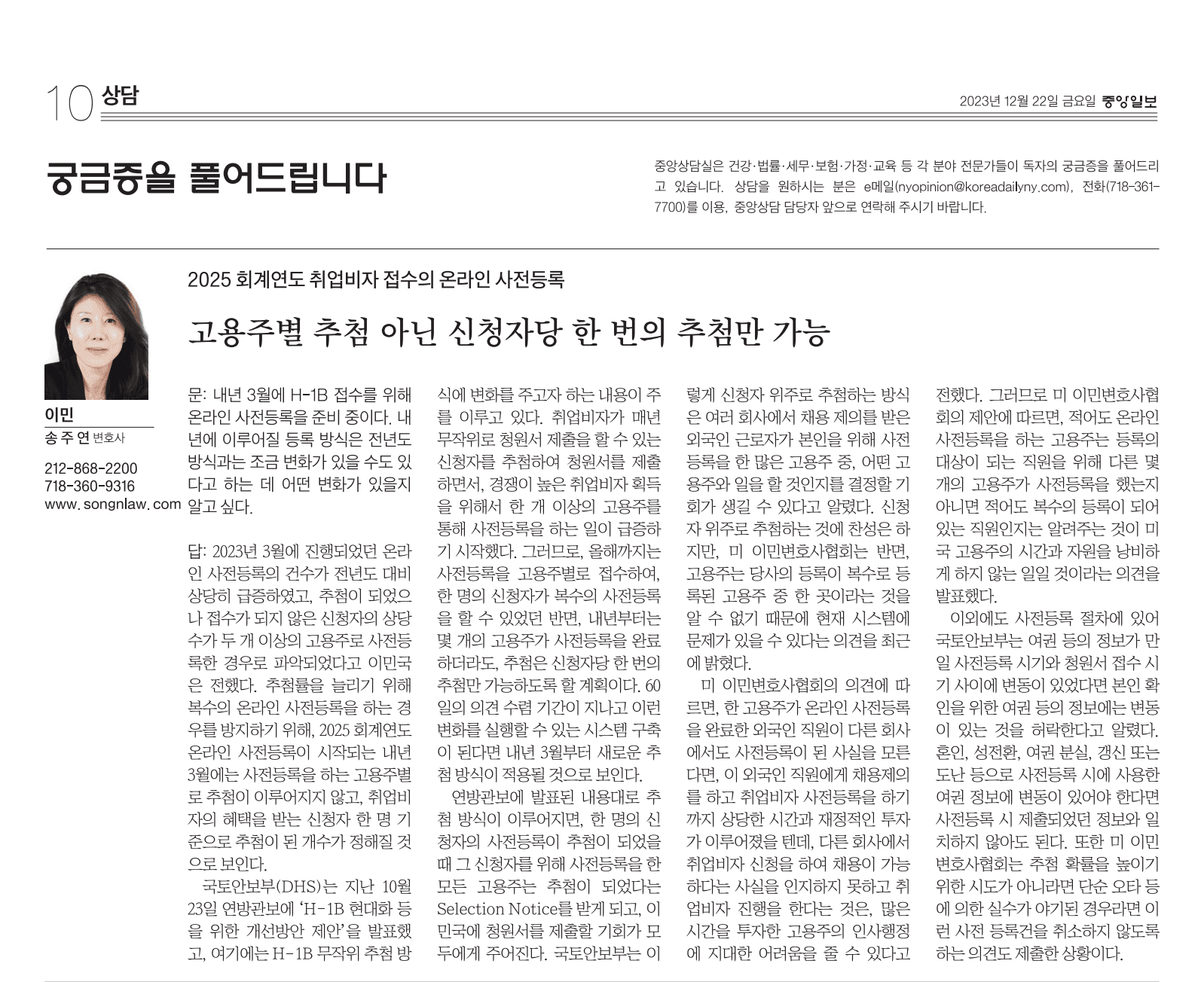 내년 3월에 H-1B 접수를 위해 온라인 사전 등록을 준비 중이다. 내년에 이루어질 등록 방식은 전년도 방식과는 조금 변화가 있을 수도 있다고 하는데, 어떤 변화가 있을지 알고 싶다.