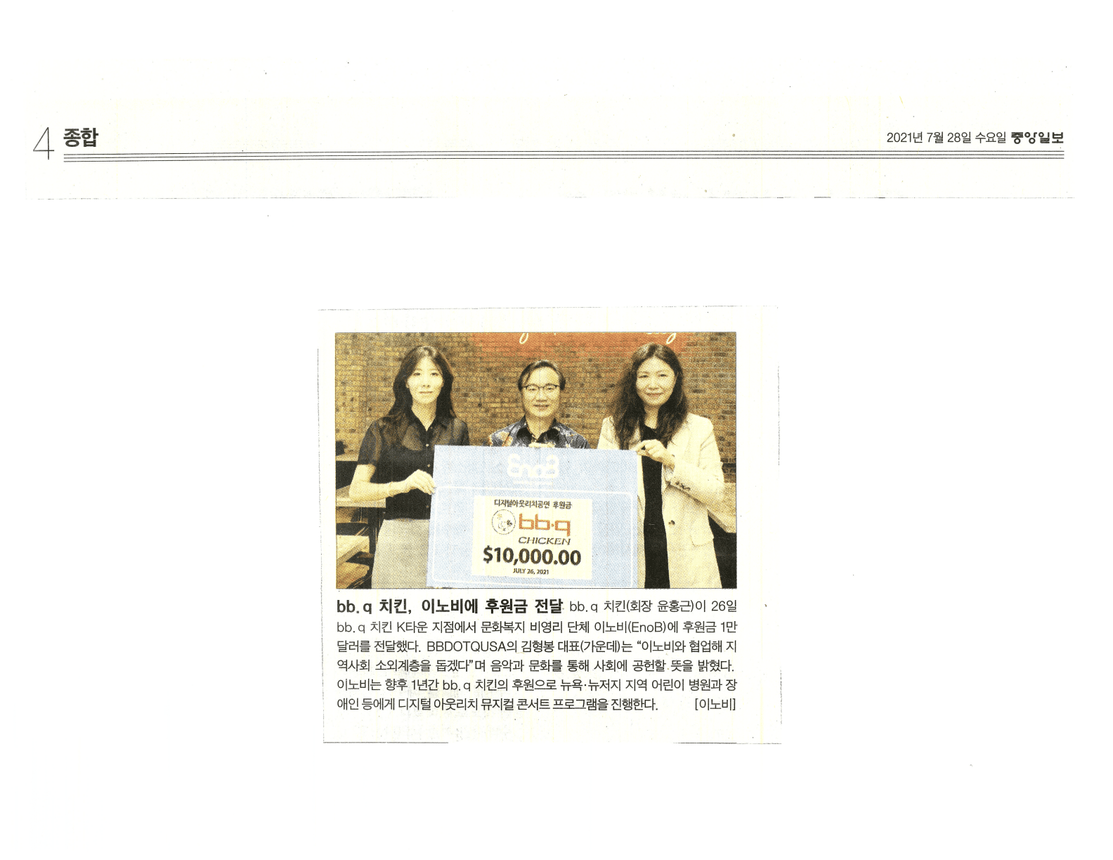 bb.q 치킨(회장 윤홍근)이 26일 bb. q 치킨 K타운 지점에서 문화복지 비영리 단체 이노비(EnoB)에 후원금 1만 달러를 전달했다. BBDOTQUSA의 김형봉 대표(가운데)는 “이노비와 협업해 지 역사회 소외계층을 돕겠다"며 음악과 문화를 통해 사회에 공헌할 뜻을 밝혔다. 이노비는 향후 1년간 bb. q 치킨의 후원으로 뉴욕·뉴저지 지역 어린이 병원과 장 애인 등에게 디지털 아웃리치 뮤지컬 콘서트 프로그램을 진행한다.